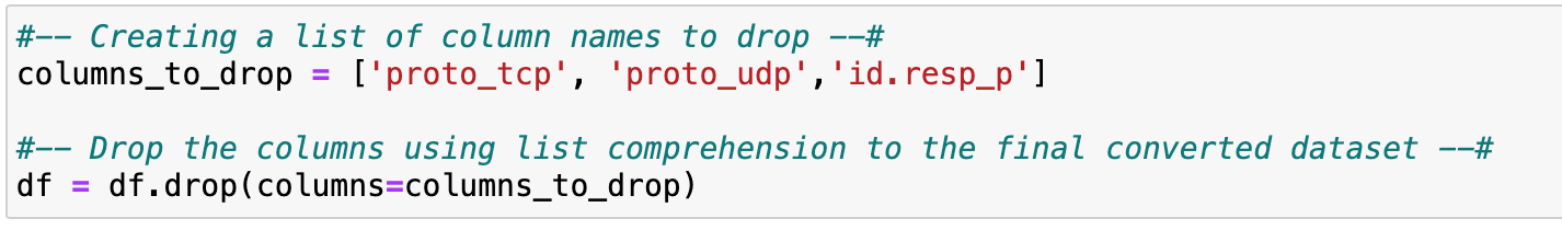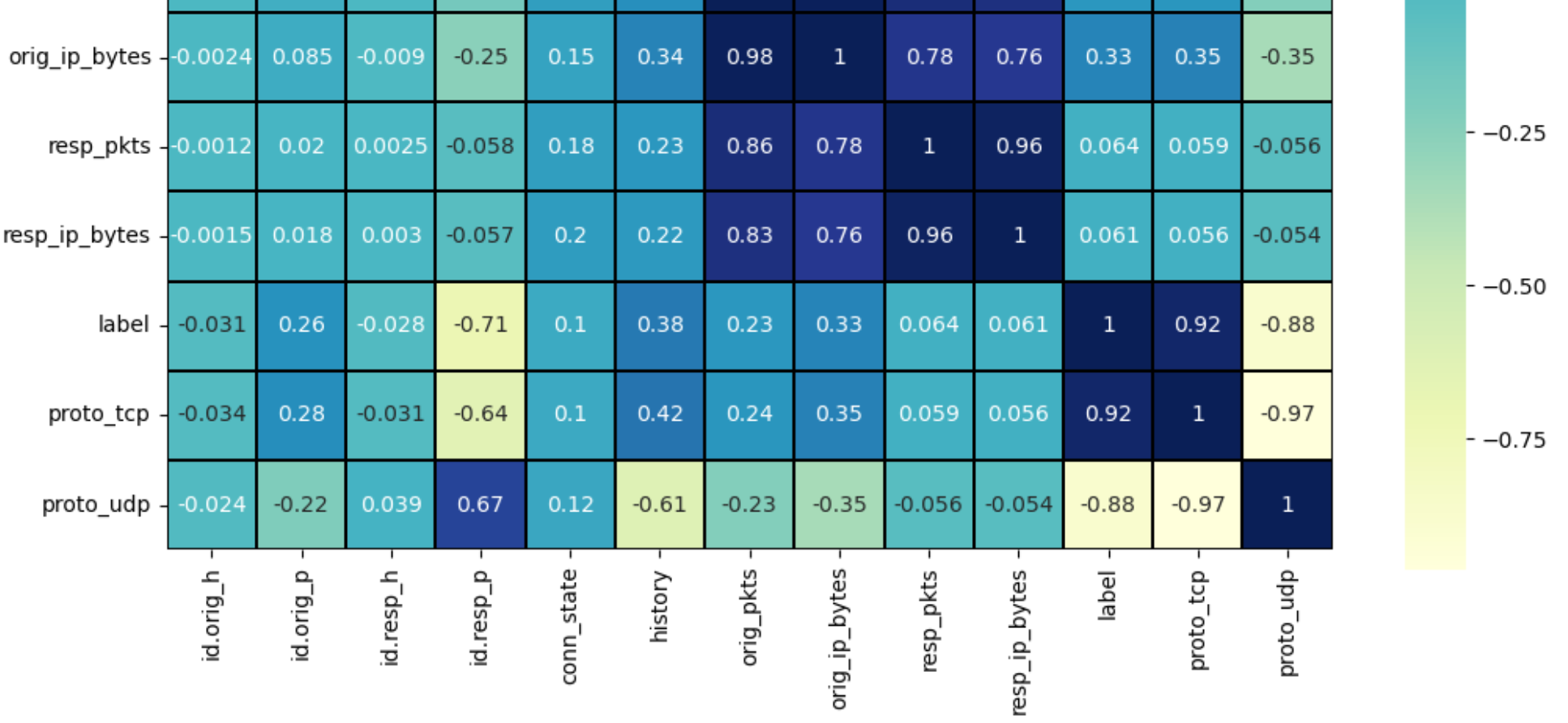 Thresholds and Cutoffs: Setting specific correlation coefficient thresholds for removal is not generally recommended as it can be overly simplistic and neglect other factors. However, to reduce redundancy and overfitting, for this analysis the general rule of 70% will be factored resulting in the removal of two variables: ‘proto’ and its two derivatives ‘tcp’ and ‘upd’ and ‘id.resp_p’.