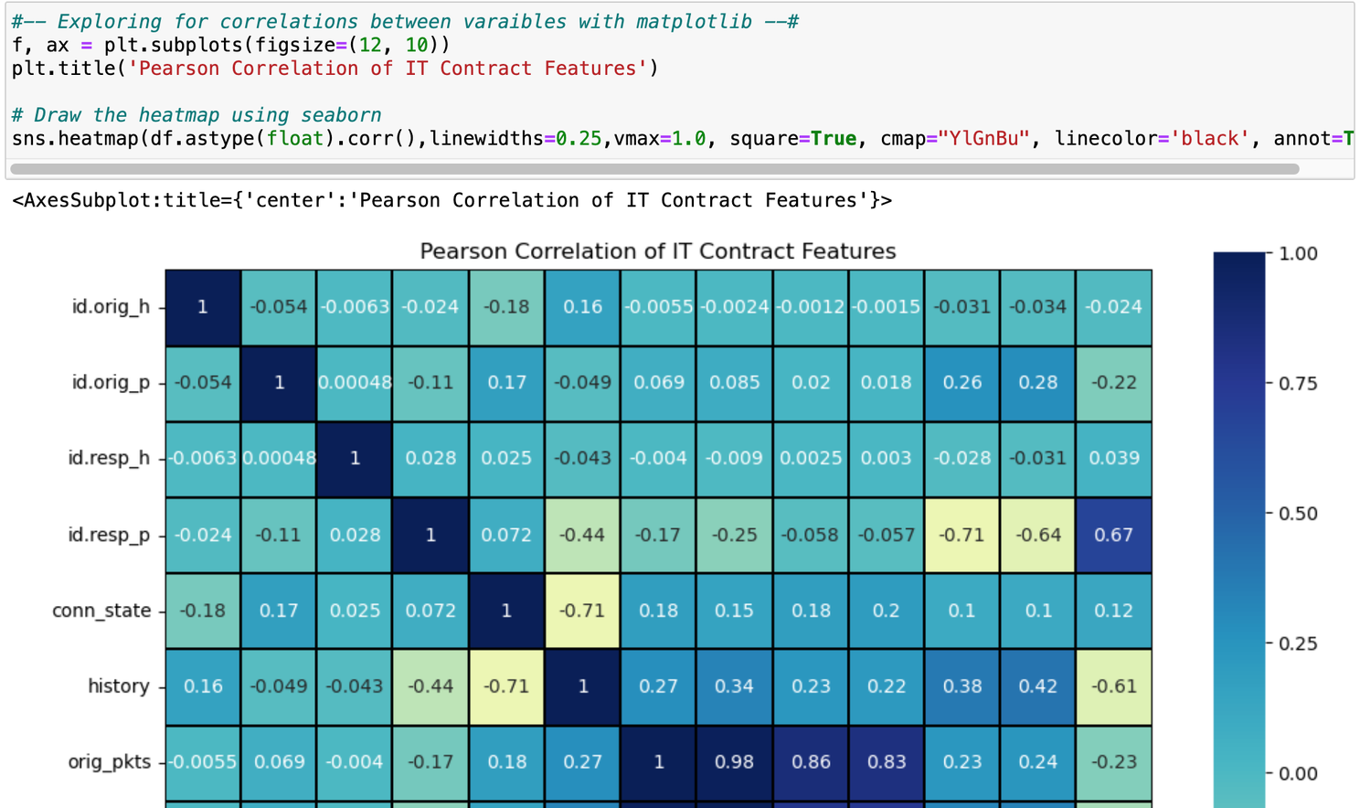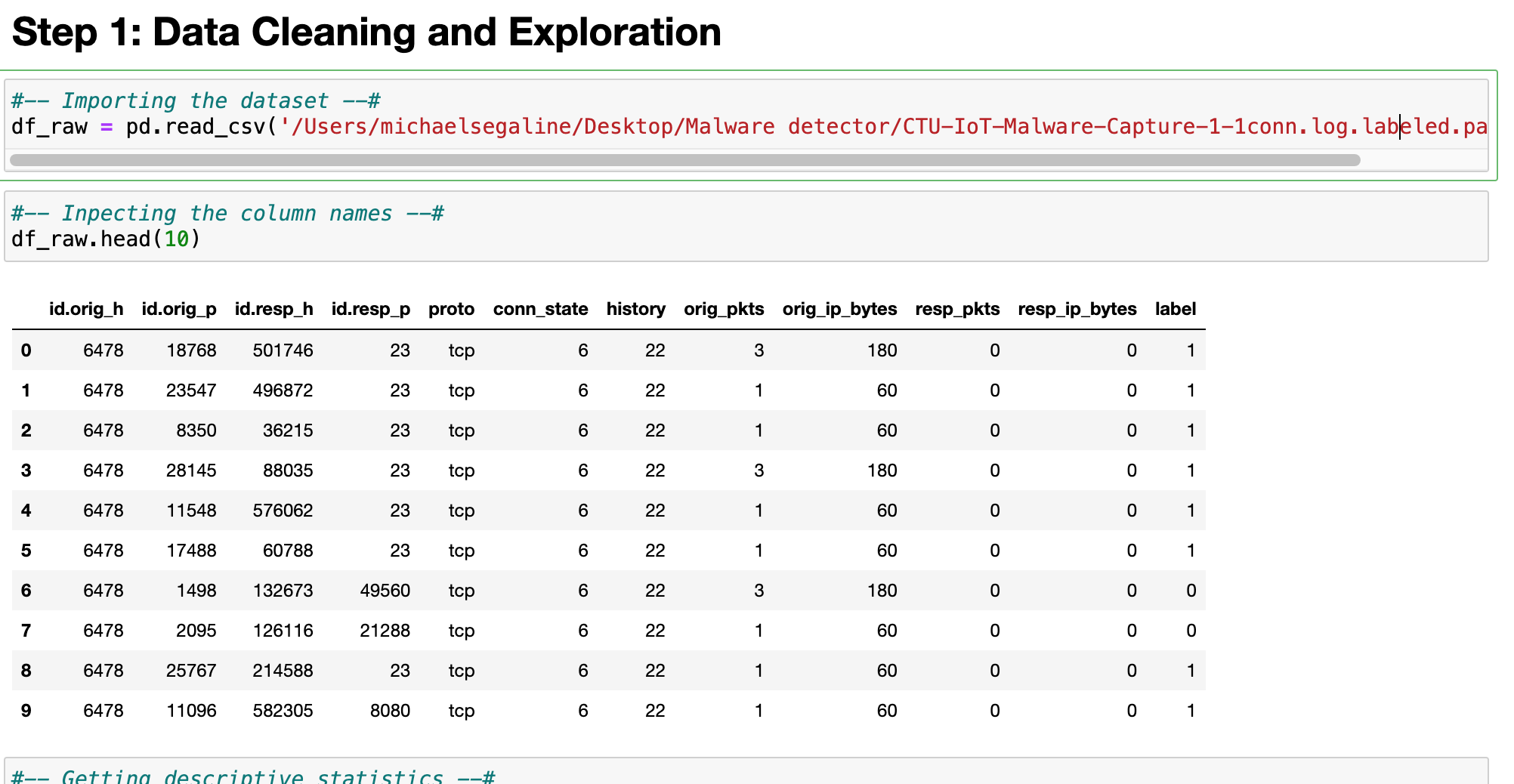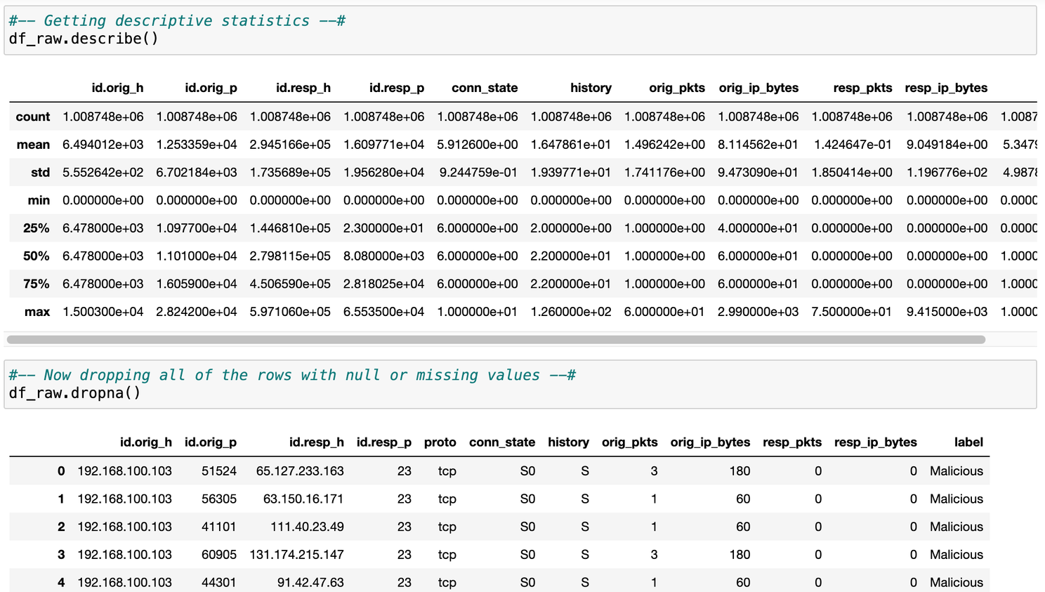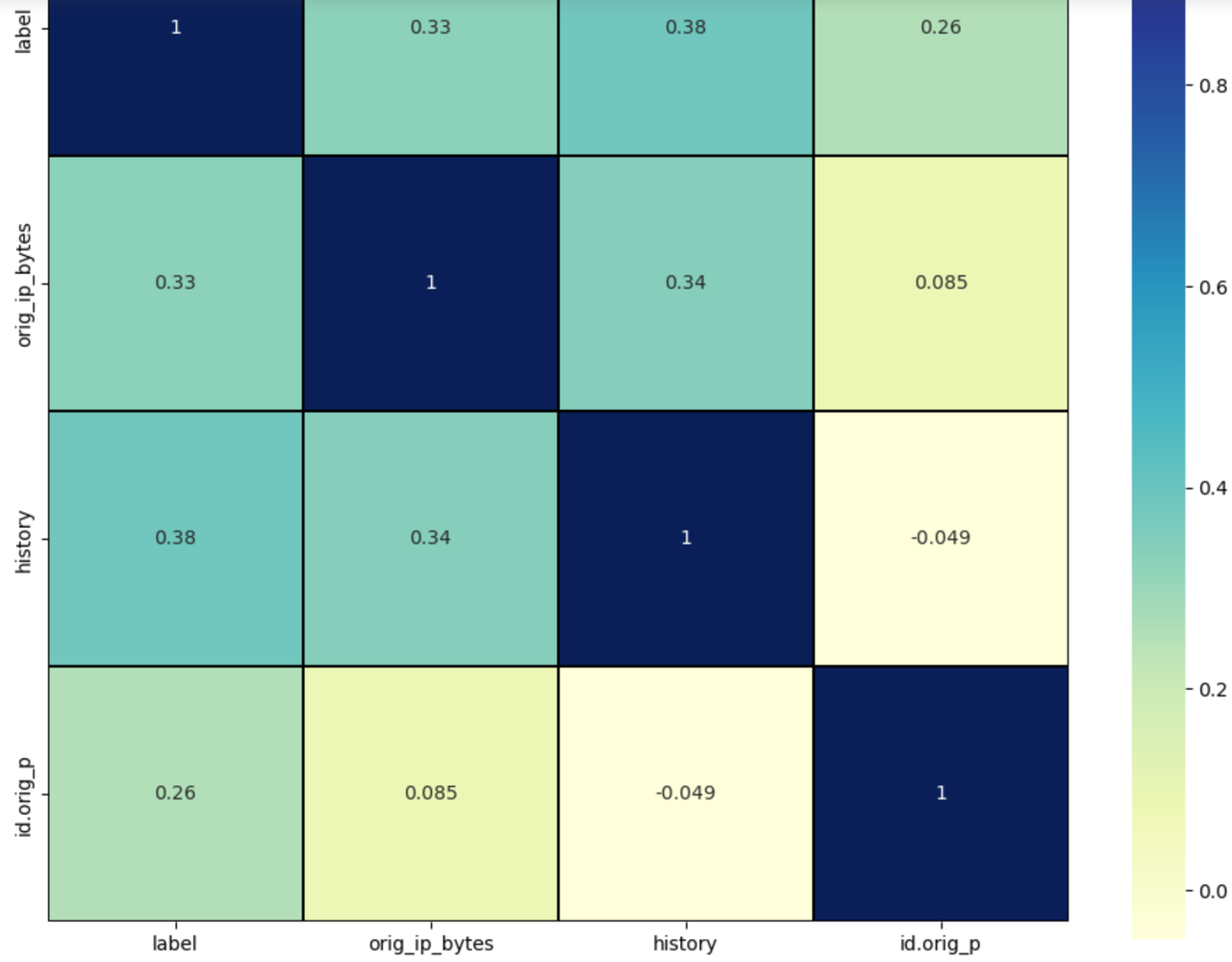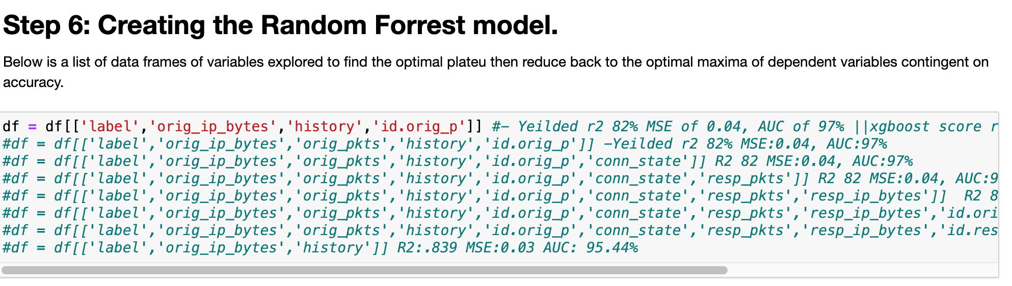 An open source dataset of Counter Threat Unit (CTU) conn.log scans of malware detection on network traffic data. Conn.logs. A Kaggle dataset from www.kaggle.com. Kaggle is the opensource repository / organization that hosts the datasets. Associated with the data on Kaggle, is a detailed break-down of all the variables from the data aggregating source, Stratosphereips.org. Stratosphereips.org has numerous terabytes of cyber security scans of all types. The dataset on Kaggle contains 10 datasets of 1 million rows each (total 10 million). For this analysis the dataset is limited to only the first 1 million rows to examine model generalization. The dataset has multiple columns for possible exploration. Delimitations for this analysis, of the original 23 columns only 13 will be considered in the initial exploration; Lastly, only 4 columns of the dataset will be used as they factor with no high multi-collinearity. Three variables are germane to the target variable, ‘label’: ‘orig_ip_bytes’, ‘history’, and ‘id.orig_p’.