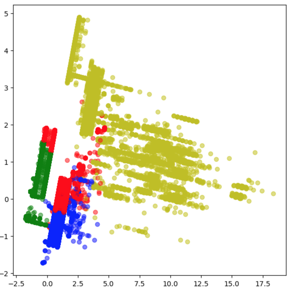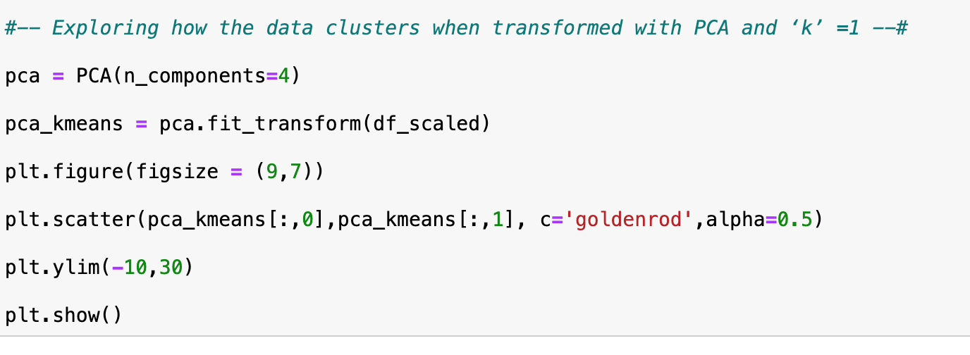 Next, the Principal Components are explored via KMeans Cluster Analysis, another unsupervised machine learning technique.