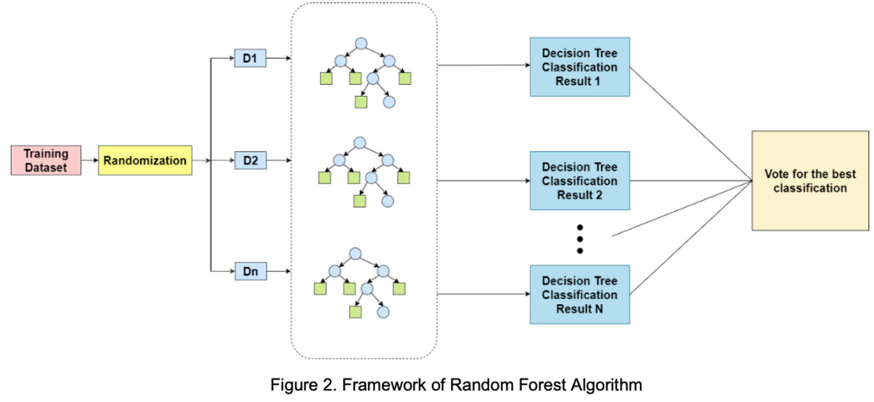 A Random Forest algorithm is an ensemble learning classification method which combines bagging and the random subspace algorithm. It tends to be a very high performing machine learning model very fast training speed and strong generalization ability. An ensemble method it can effectively prevent the overfitting problem by resampling via bootstrap the training data for each decision tree. After that the final prediction result is obtained and based on a voting algorithm by aggregating the prediction of different decision trees in the model. Additionally on ensemble methods can handle dirty data or data with missing values (scikitlearn, 2020).