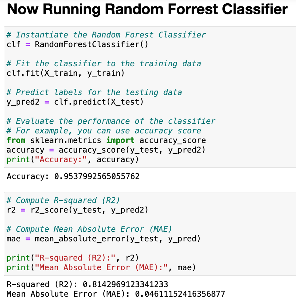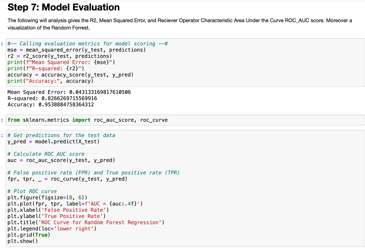 Both versions of Random Forest tested approximately the same. While the first model’s Mean Squared Error: 0.043, R-squared: 0.826, Area Under the Curve (AUC)is 97%, total Accuracy: 0.953; Correspondingly, the Classification model yielded an R-squared (R2): 0.814, Mean Absolute Error (MAE): 0.046. In general, the R2 score should be as close to 1 as possible however, have an MEA close to ‘0’, and an AUC of minimum 95%. The following precision scores indicate that the Random Forrest model should be able to generalize well on unseen data.