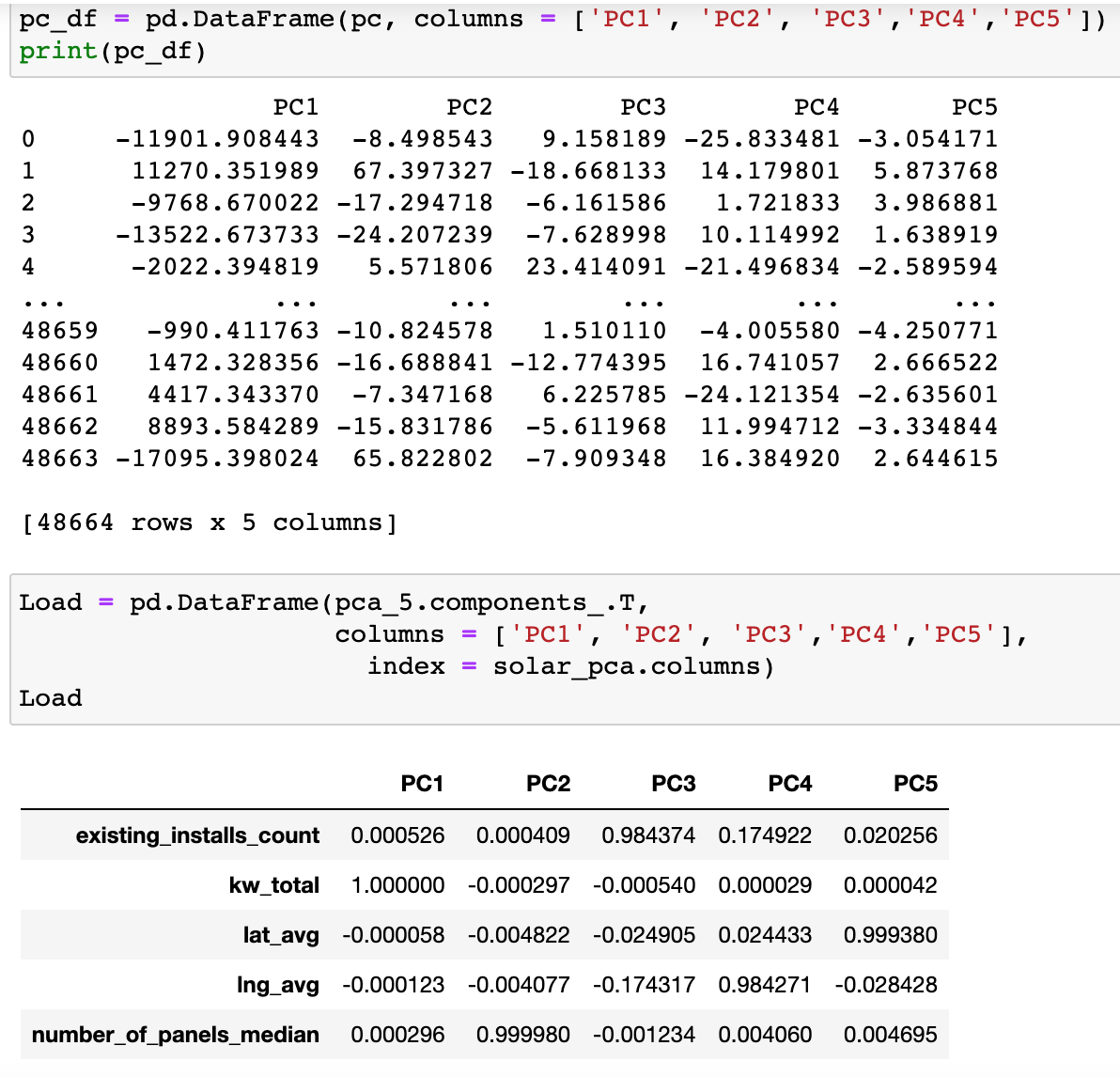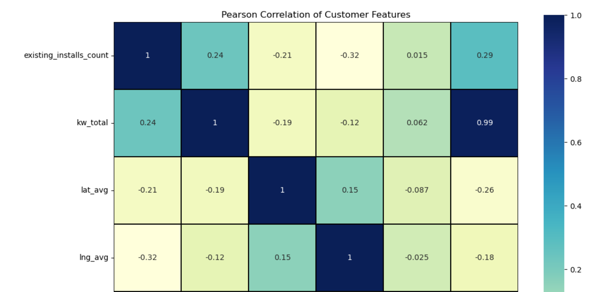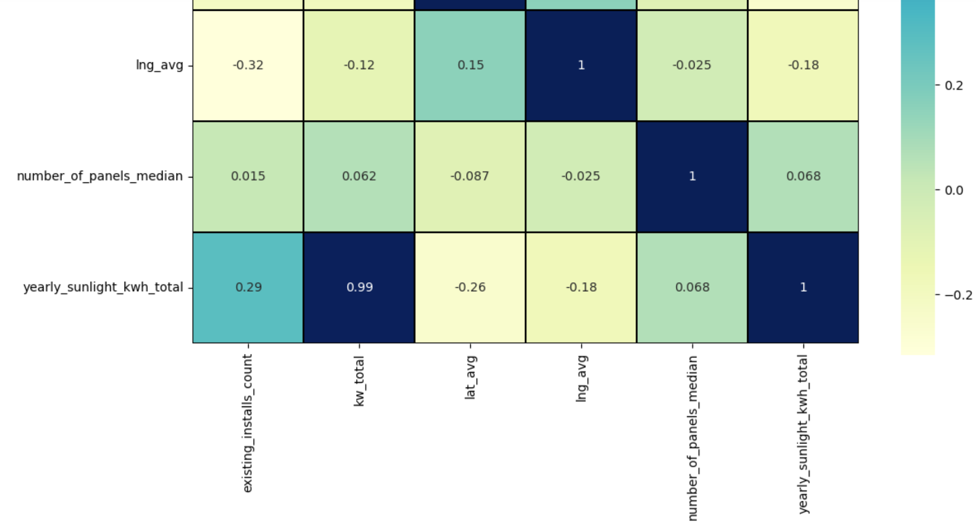 The above graph shows that ‘kw total’ is correlated to ‘yearly-sunlight-kwh-total’ at 99%. Therefore, ‘yearly-sunlight-kwh-total’ needs to be dropped due to multi-colinearity. On the graph above, the index where ‘exisiting-installs-count’ meets ‘kw_total’, indicates that 0.24 or 24% of the total kilowatts produced where from existing panels (older generation).