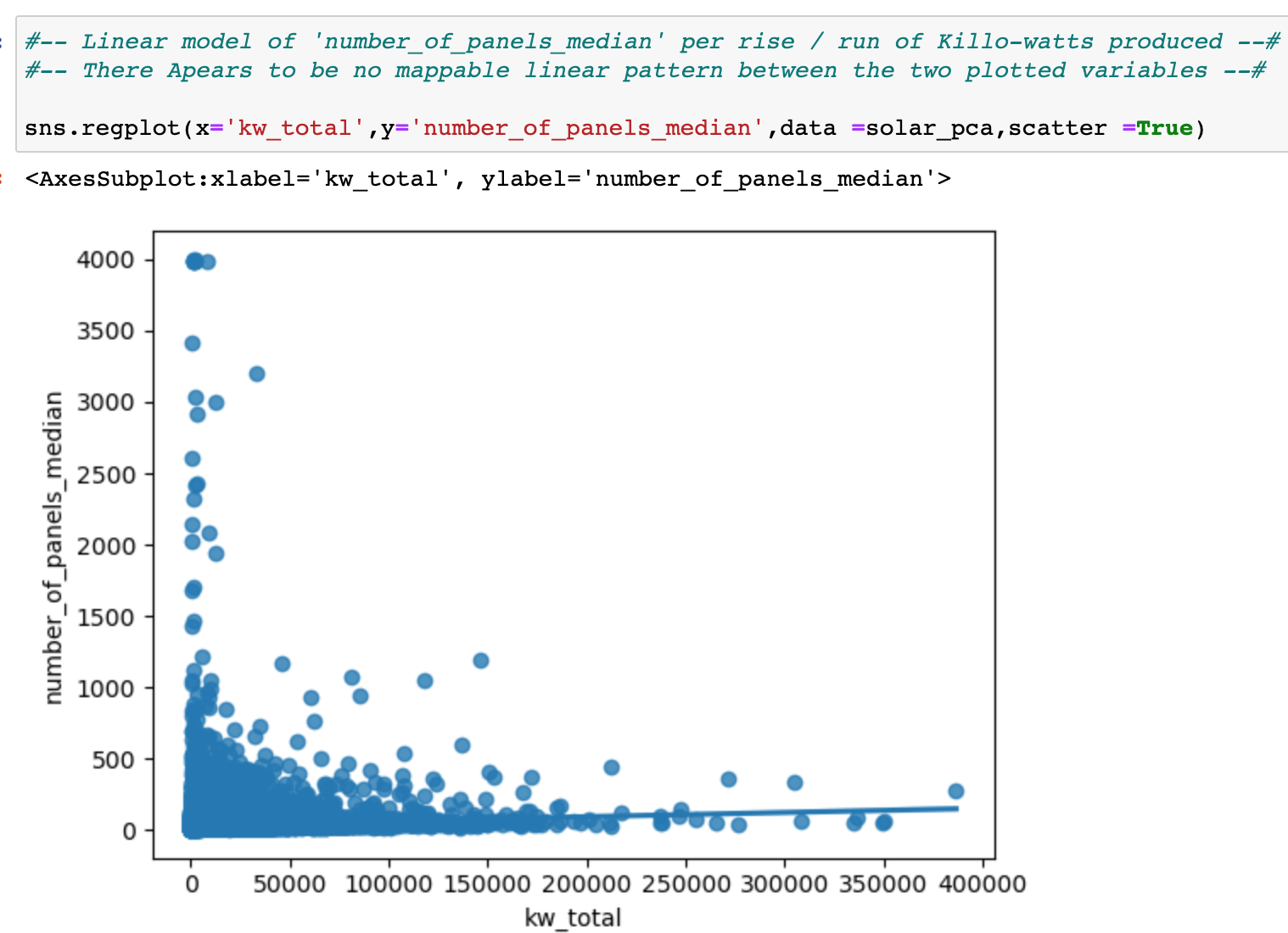 Situation, for the betterment of the human condition and planet, a big data science study was conducted given a dataset provided by Google Project Sunroof. Google Project Sunroof is a massive data mining operation, manifested primarily via satellite imagery and providing over 31 solar-panel related variables to be explored. With this information, a solar company can explore the best place to install solar panels. Mission, the aim of the study is to extract, clean, reduce, and statistically test the information; To create a linear model that can predict solar power generation based on the following variables: ‘latitude’, ‘longitude’, ‘state_name’, ‘kw_total_power’, ‘number_of_panels’, and ‘yearly_sunlight_kwh_total’. Prior to the linear model, Principal Component Analysis was conducted first, to explain the dimensionality of the dataset and reduce computation time. Resulting, in a machine learning model with a nine percent accuracy. Therefore, an accurate linear model could not be constructed from the data, due to the inherent skew in the distribution. Reasonably, no amount of ‘new’ or ‘relevant’ data, added to the analysis, will change earth’s position in space relative to the sun. States on or near of the 38 degrees latitude or -80 degrees longitude will receive more average sunlight and produce more power than northern states. The only exception appears to be Washington State, as it generates the most power output per panels, in the United States; Ranking it almost equal to the State of Florida.