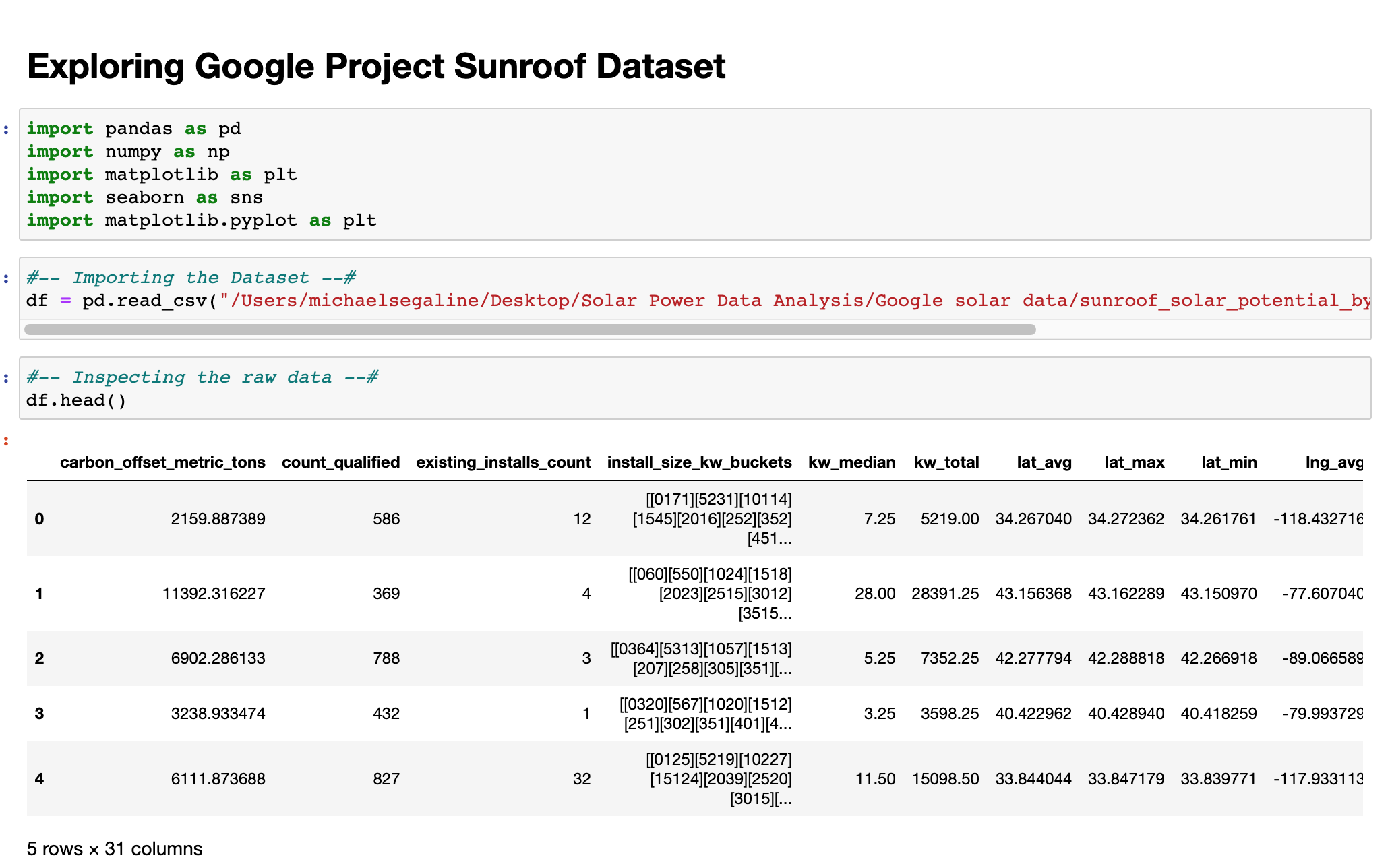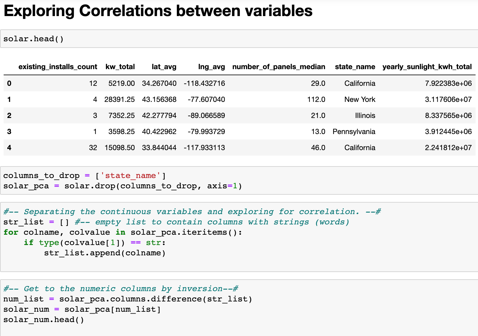 An opensource dataset of Google Project Sunroof data containing the necessary variables. A Kaggle dataset from kaggle.com. Kaggle is the opensource repository / organization that hosts the datasets. The dataset contains almost 48,722 rows (before any rows where removed) and 31 columns. The dataset is limited to only 3 years of Google Project Sunroof data; Uploaded from 2017 – 2018. The dataset has multiple columns for possible exploration. Delimitations for this analysis, only 5 columns of the dataset will be used as they factor into the model. The dataset is easy to work with. The variables of: ‘Existing_installs_count’, ‘kw_total’, ‘lat_avg’, ‘lng_avg’, and ‘number_of_panels_median’; The dataset is easy to work with because the columns contain integer values. Limitations of the study is that 6 variables will be observed, one variable ‘yearly_sunlight_kwh_total’, was removed due to multicollinearity. Of 31 variables only 5 will be considered for the study. Below is an image of the variables used.