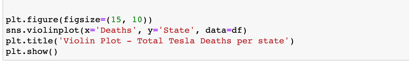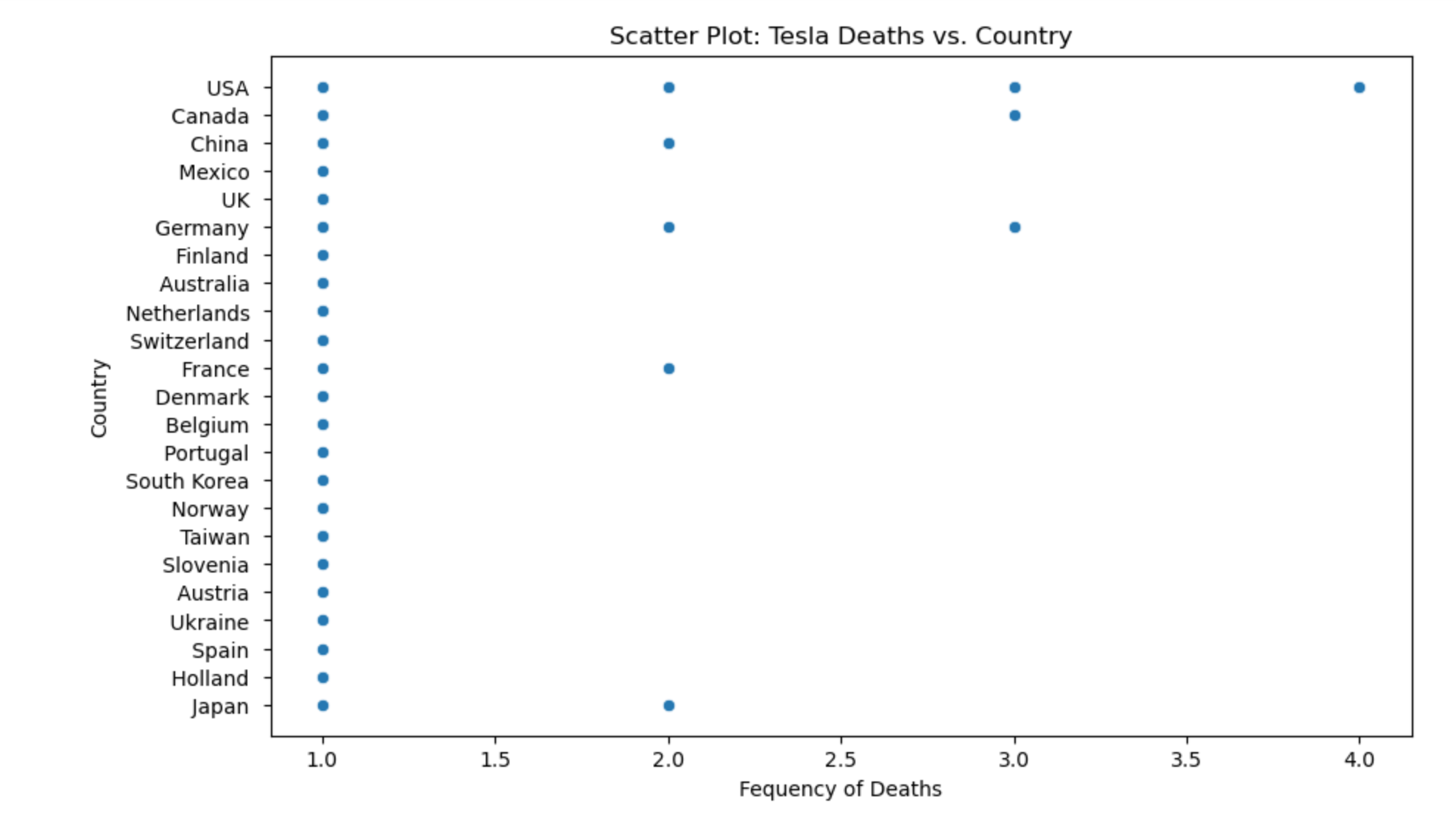 Below shows the frequency of Tesla car deaths against country. It would appear, that more people are willing to initially ride as passengers in USA, Canada, Germany, and China.