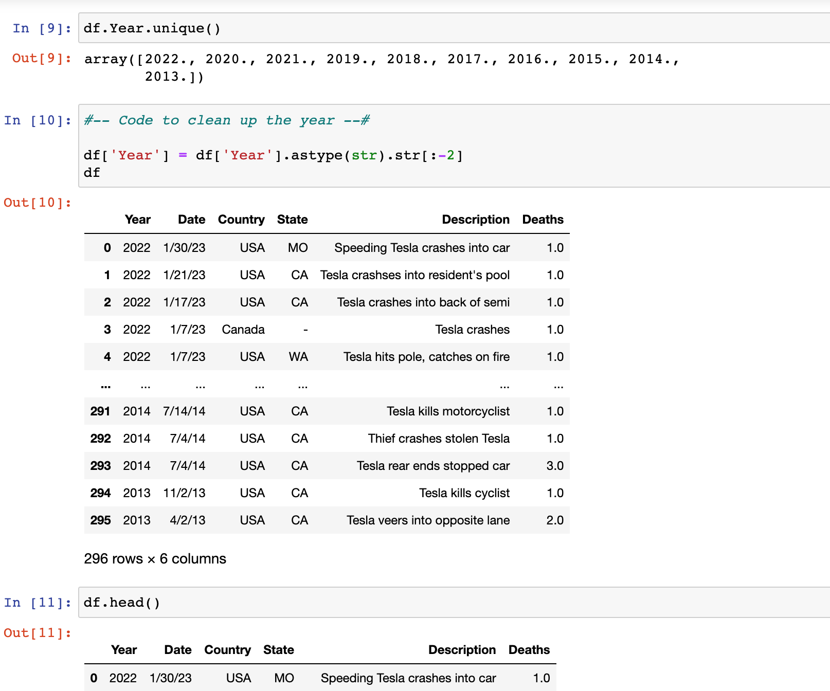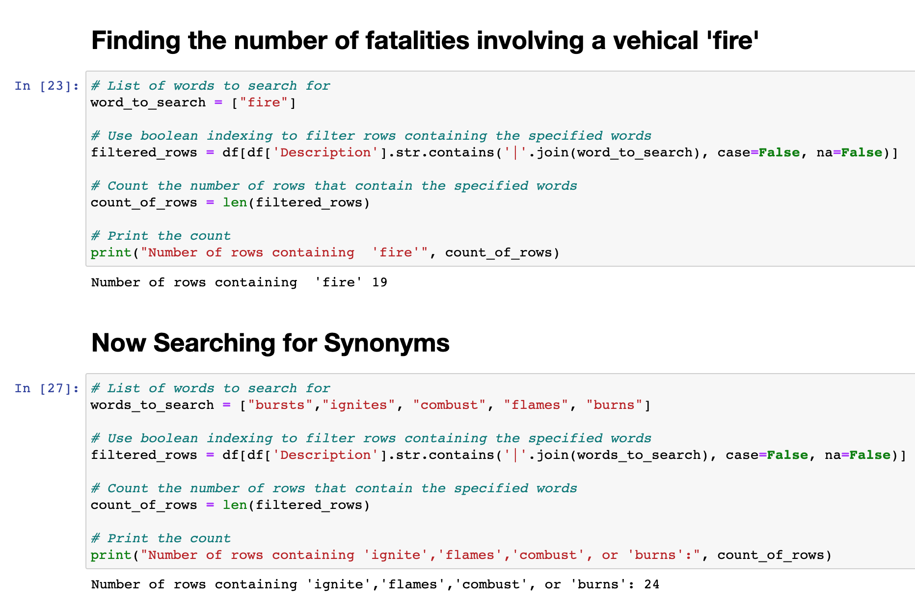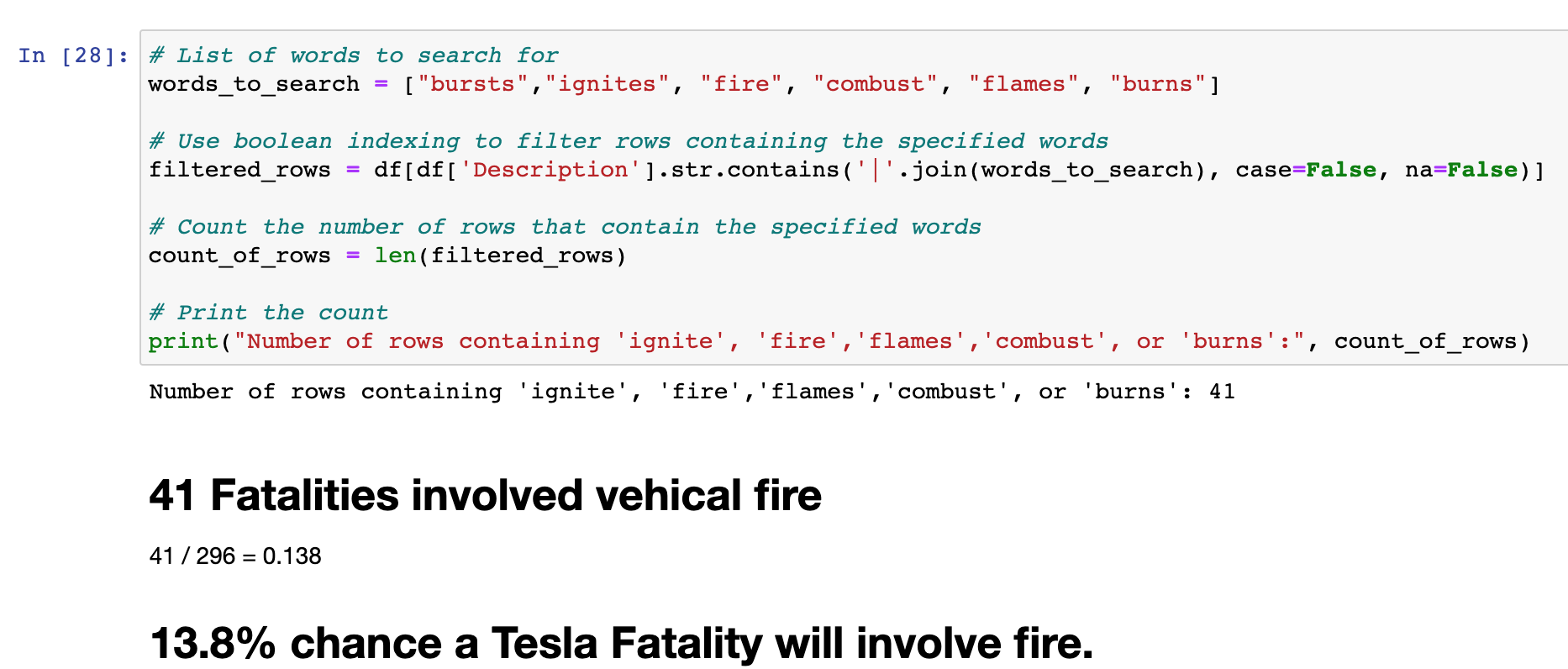 With the rise of Electric Vehicles on the roads and policy makers with aspirations of reduced carbon emissions, there poses a glaring statistic documented in the crash “descriptions” column of over 296 deadly accidents involving Tesla vehicles from 2013 – 2022. While 296 accidents is not that many in hindsight, further sample testing must be conducted in the future to determine if the information is statistically significant to the overall vehicle population. The descriptive statistic now serves as a baseline to compare against other Electric Vehicle (EV) makers and EV fires vs. combustion engine fires. The data was cleaned and explored. The crash “description” column was iterated over and a WordCloud display of word frequency produced; Followed by a count of unique rows containing the following words: “Fire”, “ignites”, “combusts”. The result was 41 unique cases / 296 total = 13.8% involving “fire”.