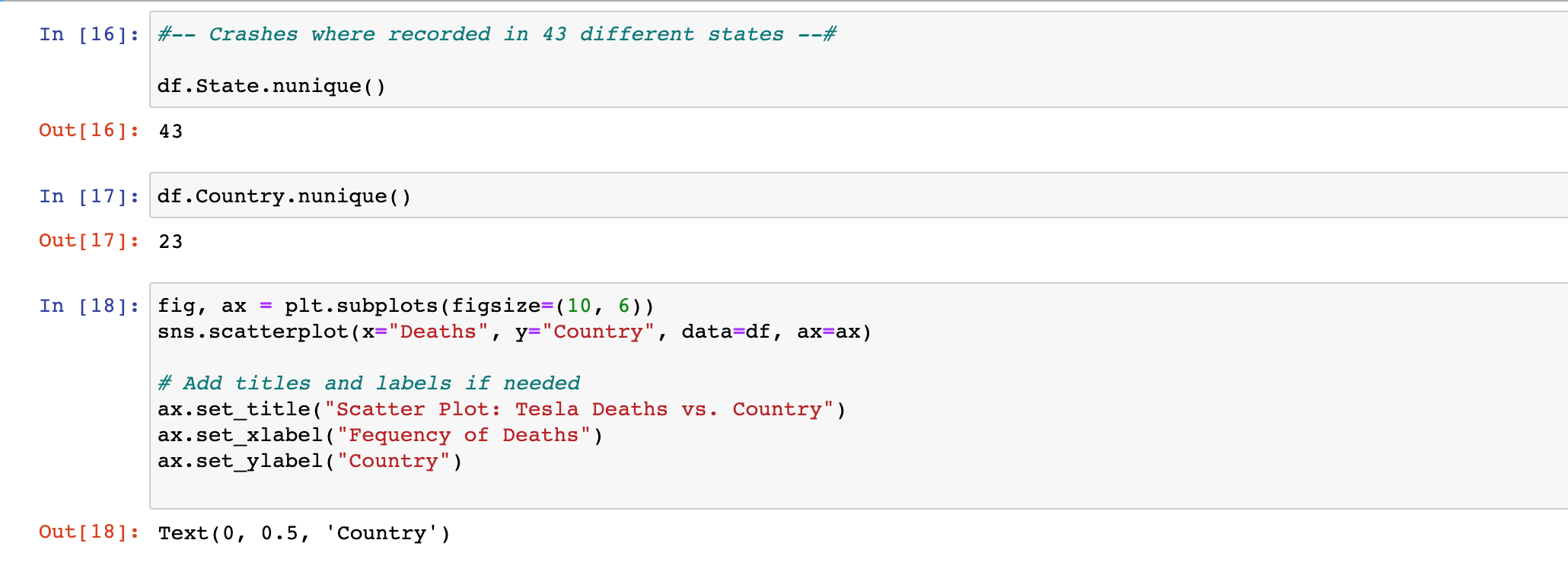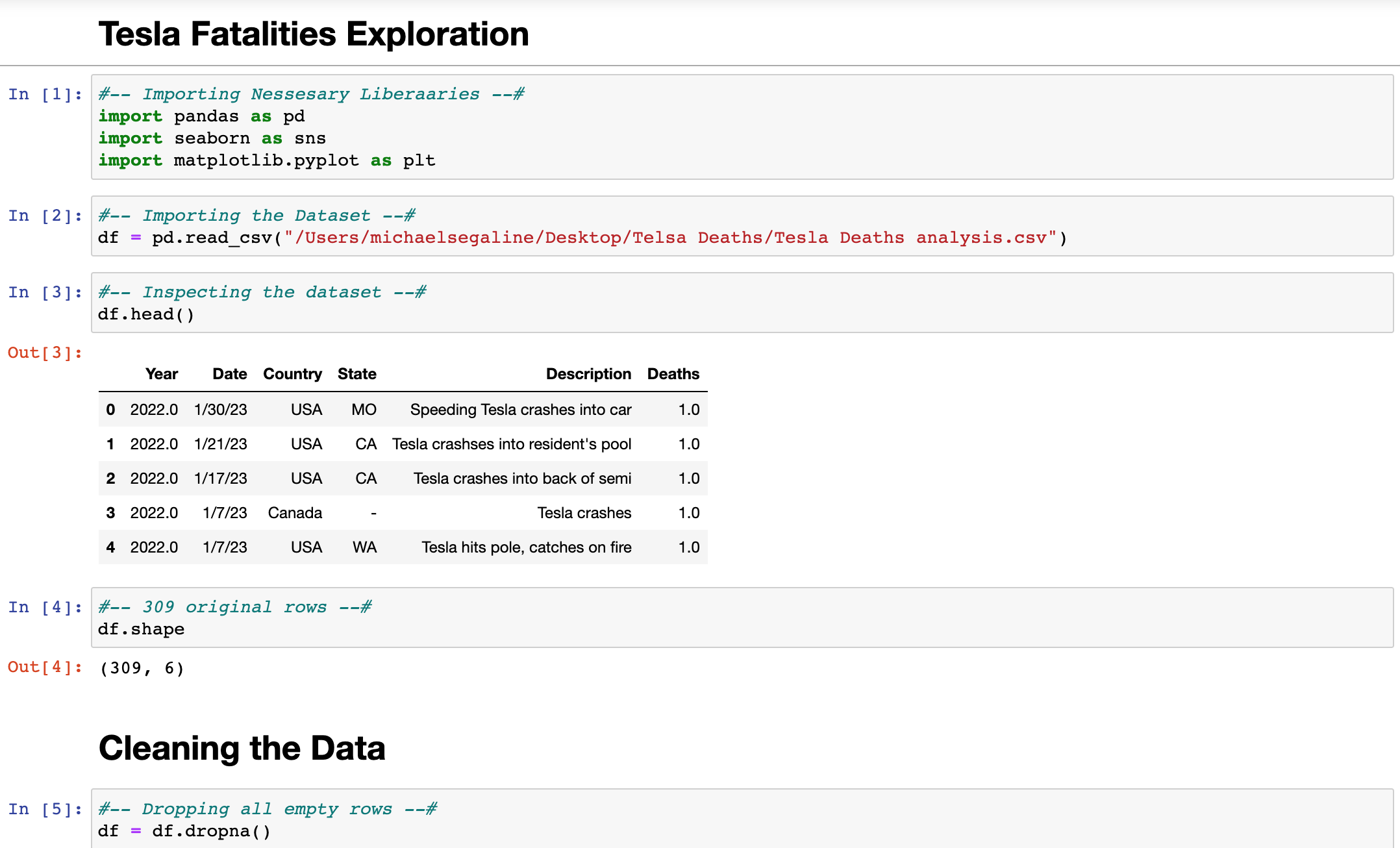 when cleaned and explored, the Tesla Motor Fatalities Dataset indicates, that more victims are passengers in the countries of: USA, Canada, Germany, and China; While the vast majority of deaths involve one person. Noticeable increase in deaths starting at 2020. The number of Tesla deaths doubled in 2022 vs. 2021. Since the inception of the Tesla EV, only 43 states have had fatalities. The words describing the fatalities, ‘fire’ and its synonyms where counted in 41 different instances; yielding a descriptive statistics of 13.8 % of Tesla Motors fatalities involving flames. As a baseline statistic, this study can now be useful in distribution testing relative to the U.S. auto deaths population baseline. Overall, more data, needs to collected and examined overtime to monitor this trend. Also, this study serves as a baseline for comparing Electric Vehicles (EVs) as more automakers manufacture for the daily driving.