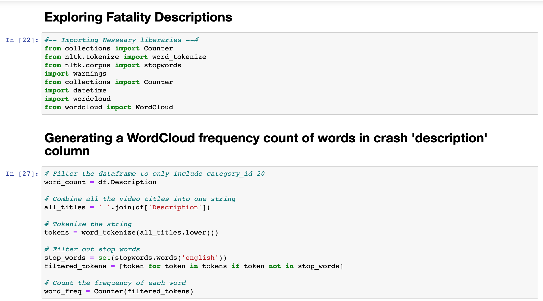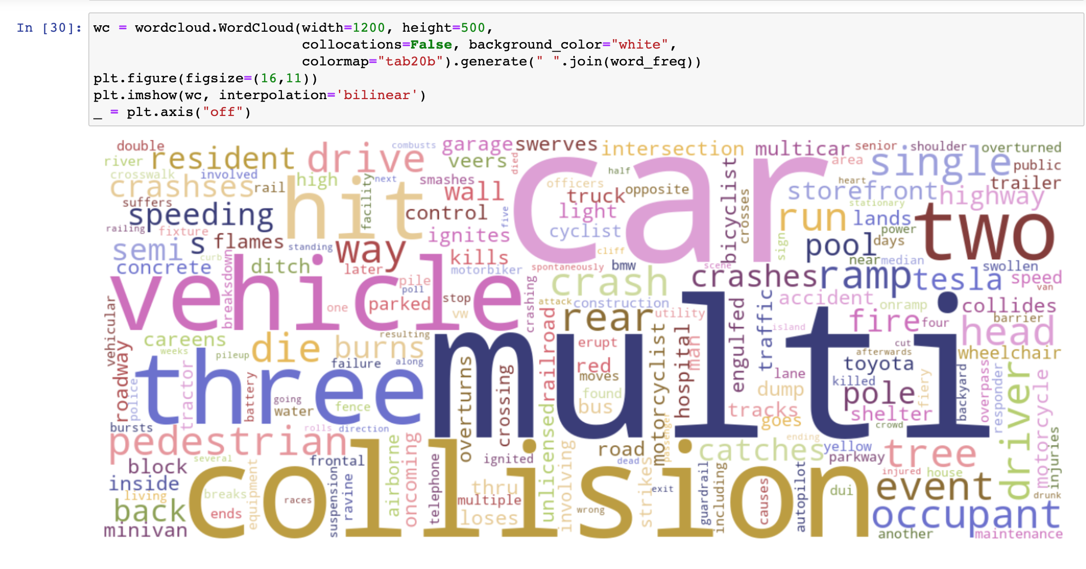 The following code takes all the words in the crash descriptions column of the data set and outputs a display of the common used words in the corpus.