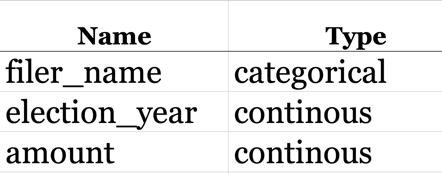 An open-source dataset of campaign contributions data containing the necessary variables about donations in Washington State can be sourced from www.Data.gov. Data.gov is the open-source repository / organization that hosts the datasets.  The dataset contains almost 6,136,766 rows (before any rows where removed) and 35 columns. The dataset is limited to only 19 years of Washington State Campaign contributions; Spanning the years of 2007 – 2026. The dataset has multiple columns for possible exploration. Due to extreme sparsity in the majority of variables, delimitations for only 3 columns of the dataset will be used as they factor into data relevance and cleanliness: The ‘filer_name’, ‘amount’, and ‘election_year’. However, only two variables: ‘amount’ and ‘election_year’ will factor into the model’s predictions.