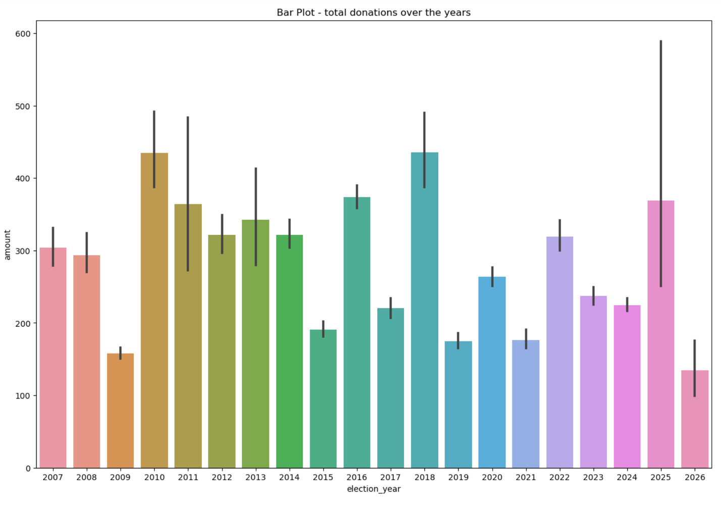 sns.barplot(data = df, x=”election_year”, y= ‘amount’)