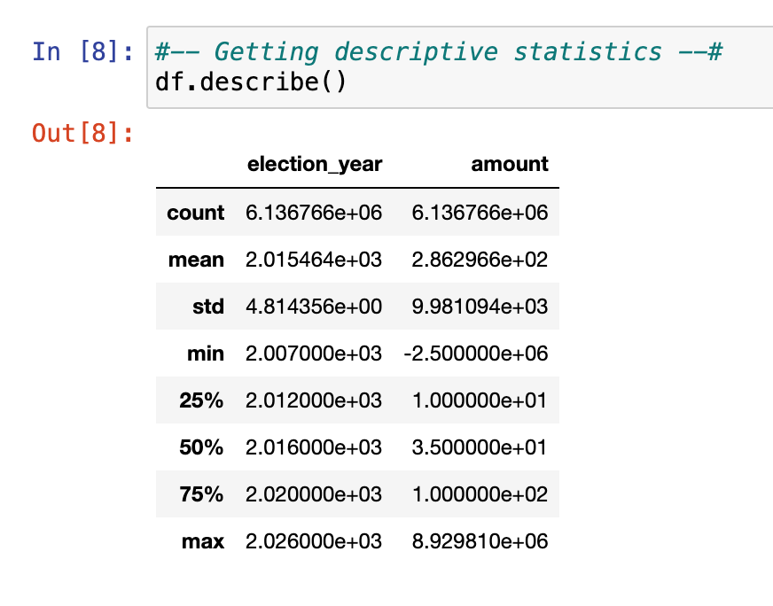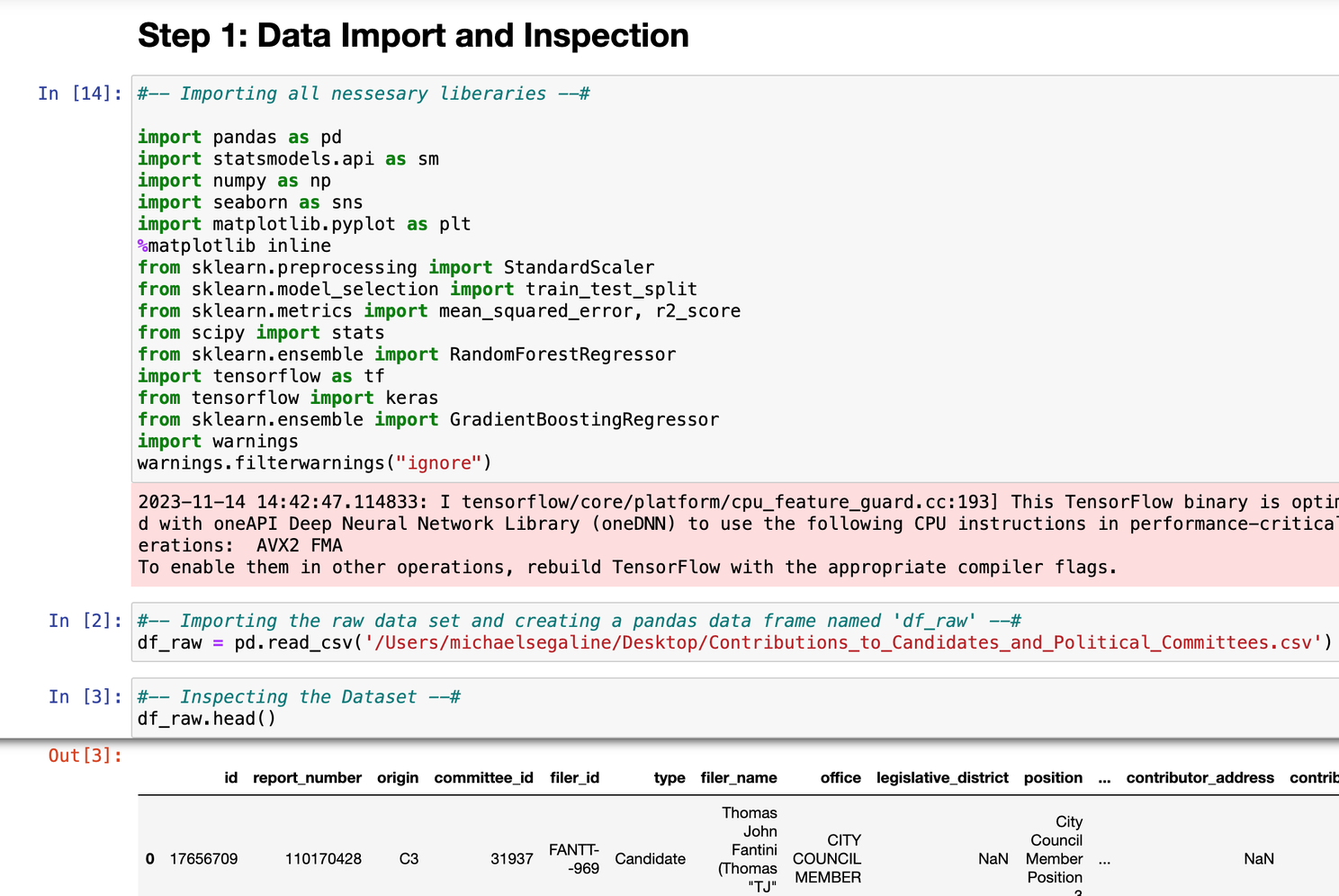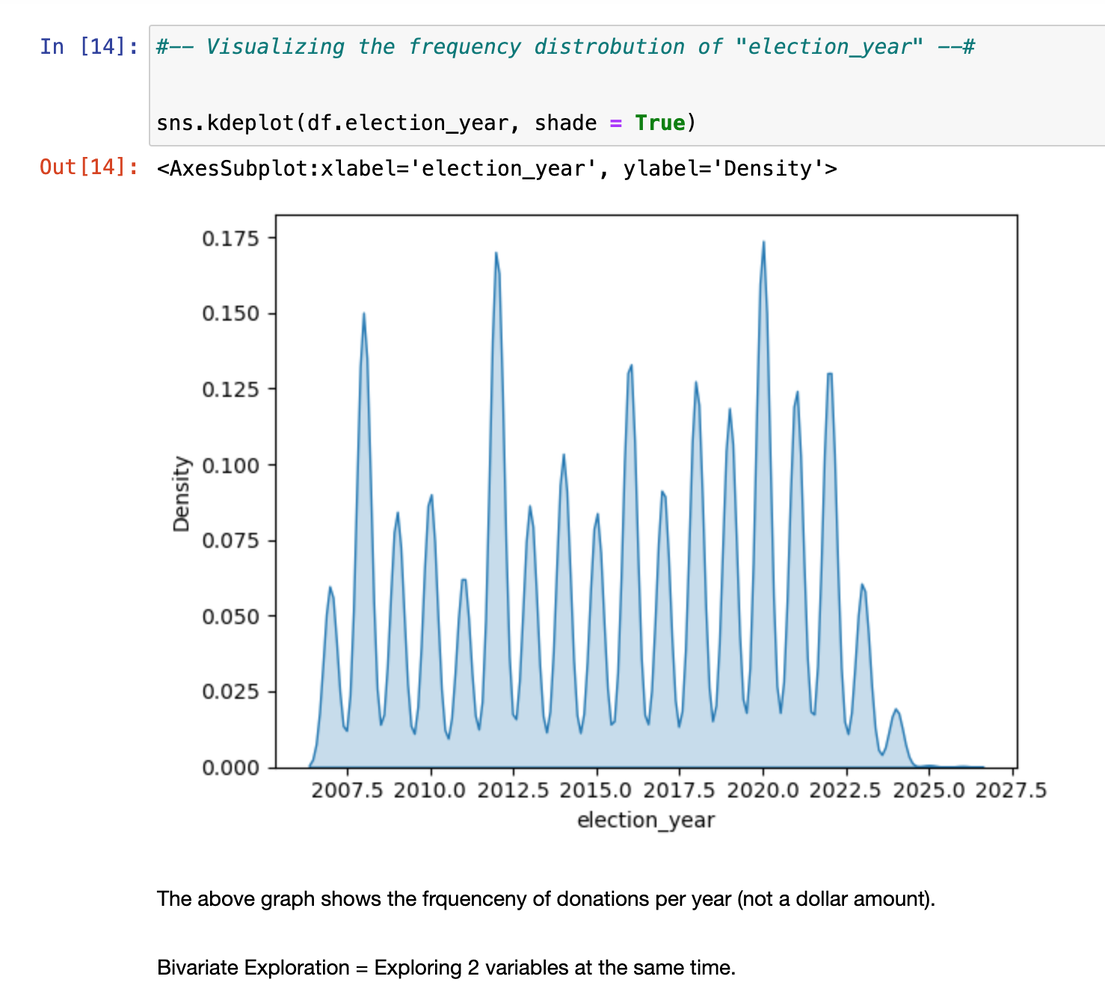 Project Outcomes: In order to find statistically significant differences, the proposed end state is a non-parametric predictive statistical model is that is used to forecast the value of a variable based on the value of another variable. (IBM,2019).  A visualization of the frequency distribution of the ‘amount’ against a ‘election_year’ timeline, indexed at 2007. A cleaned dataset of all the correctly labeled columns and rows, for replication. A better understanding of previously stated groups with exploratory graphs, giving support as to what time engagement maybe highest. Lastly, a copy of the Jupyter NoteBook with the Python code will be available, along with a video presentation. According to the same study Linear Regression was instrumental in support for alternative hypothesis, against other categorical variables. (Sagepub, 2022).