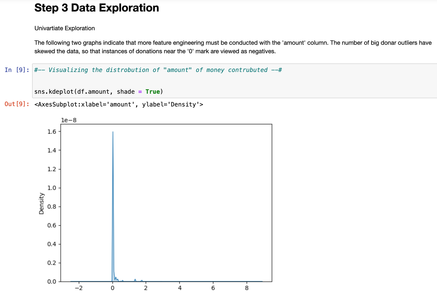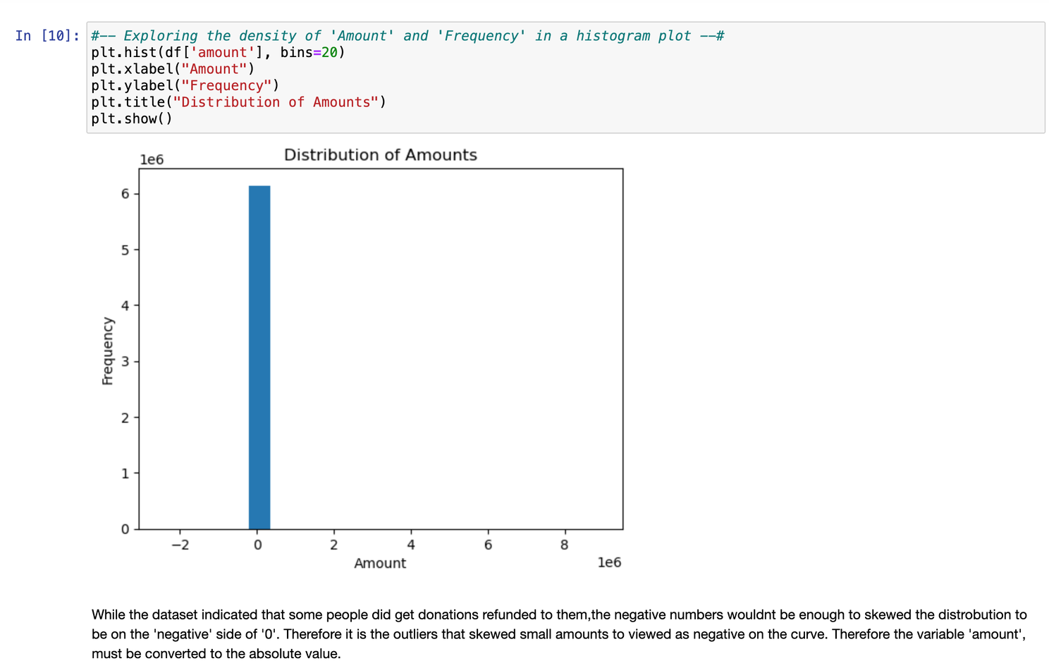 While the dataset indicated that some people did get donations refunded to them, the negative numbers wouldn’t be enough to skewed the distribution to be on the ‘negative’ side of ‘0’. Therefore, it is the outliers that skewed small amounts to viewed as negative on the curve; Ergo, the variable ‘amount’, must be converted to the absolute value.