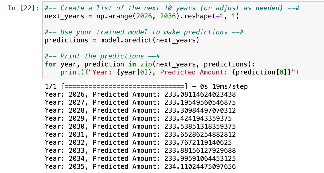 The neural net yielded a Mean Squared Error score of 42,909,140 after 10 epochs. When testing other model weights, it would be too computationally expensive to run, say 100, epochs to increase the model accuracy. The running more epochs wont necessary improve the model score either. Lastly the model predictions for the next 10 years is trending around the $233 mark.