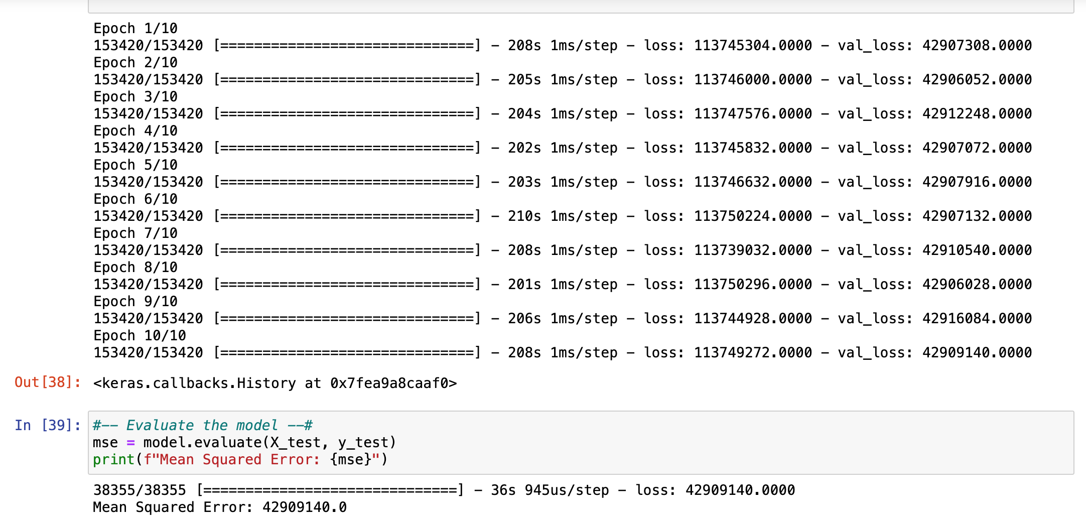 The Mean Squared Error (MSE) is a metric used to measure the average squared difference between the predicted values and the actual values in a regression problem. It’s calculated by taking the average of the squares of the differences between the predicted and actual values for each data point. MSE is a crucial tool to assess the accuracy of a regression model, where a lower MSE indicates that the model is closer to the actual values. With a MSE of 42,907,193 does not indicate that the model is nowhere near accurate and identical to the Neural Net’s MSE score.