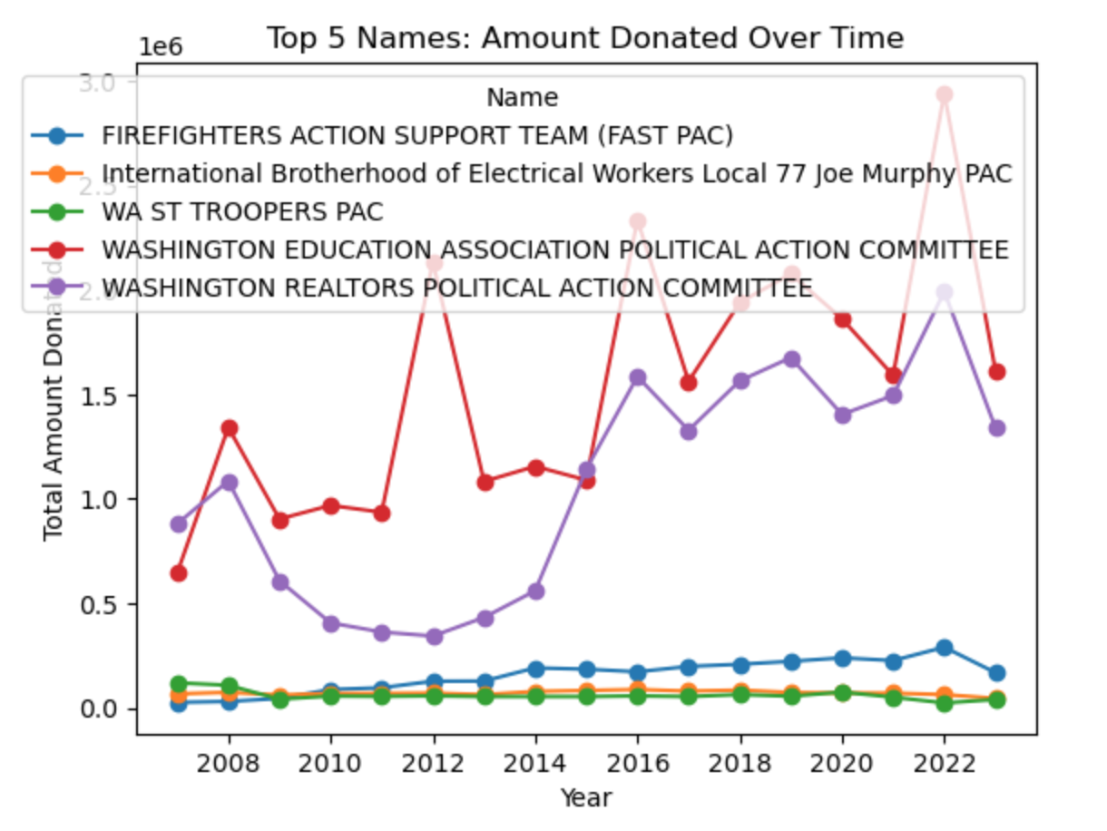 The above output was rendered with the top 5 PACS: Washington Education Association Political Action Committee (WEP) and Washington Relators Political Action Committee (RAP) are the most frequent givers to political initiatives or candidates; Meanwhile, Firefighters Action Support Team is in a distant 3rd place.