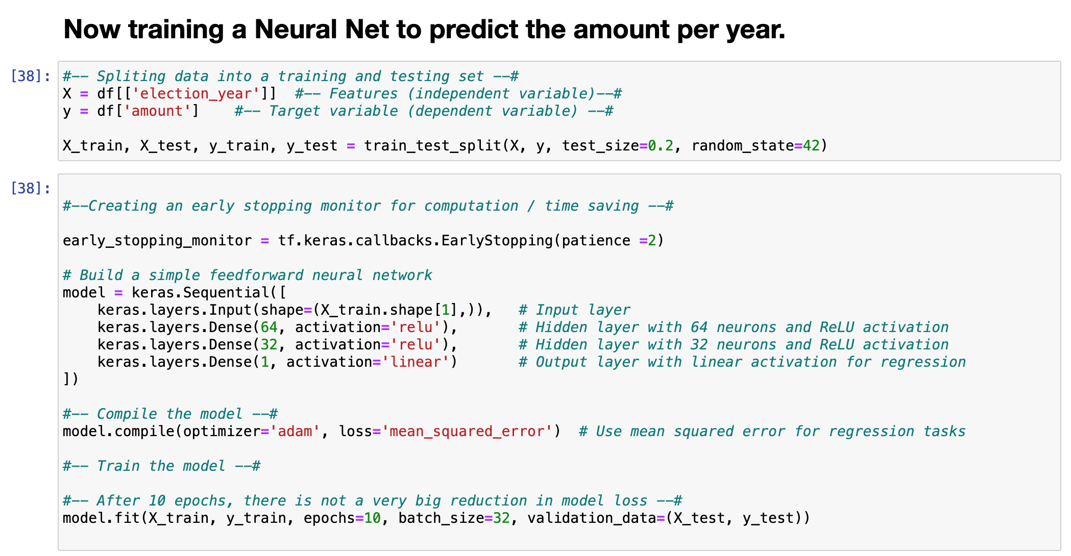 With a MSE of 99,618,388 does not indicate that the model is nowhere near accurate and identical to the Neural Net’s MSE score. Moreover, an R2 score of 0.000006 is not an accurate model. In the above timeline, 2018 is the densest year for political donations.