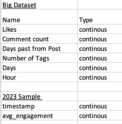 The larger dataset contains variables including ‘Likes,’ ‘Comment count,’ ‘Days past from post,’ ‘Number of Tags,’ ‘Day,’ and ‘Hour.’ Meanwhile, the smaller dataset is limited to ‘timestamp’ and ‘avg_engagement.’ Python programming is employed for analysis, with a primary emphasis on big data.