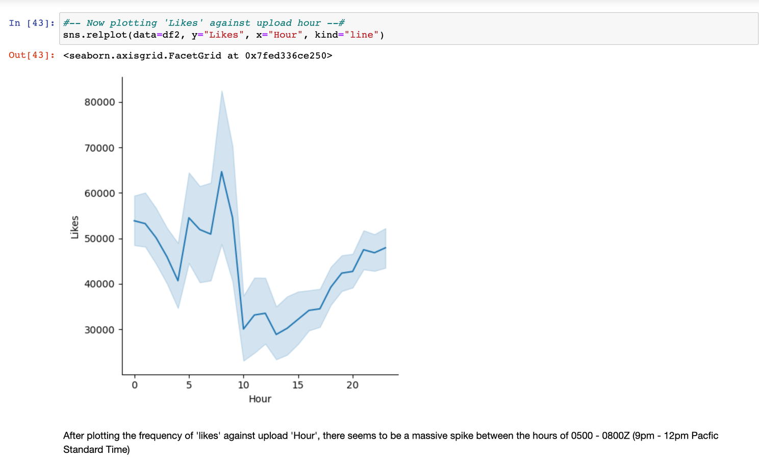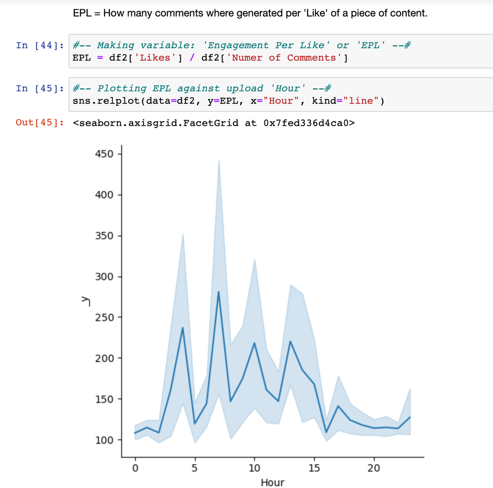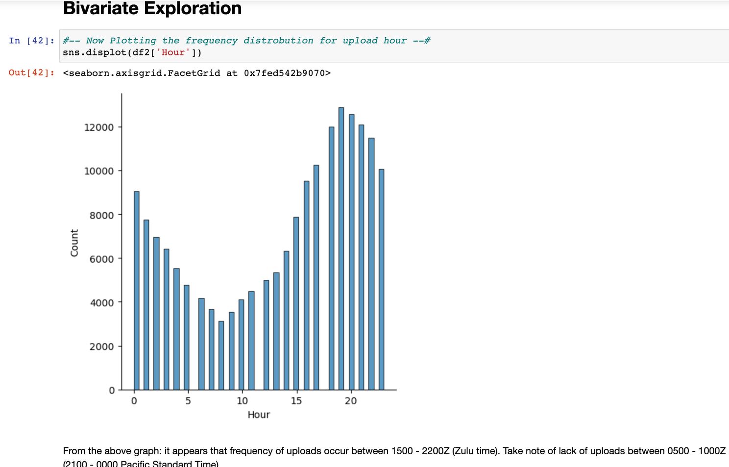 While most frequencies of content uploads happen between the 1500 to 2200 Zulu time hour, the time-window for the maximum engagement is 0500 to 0800 Zulu (9-12 PST). This was apparent in the small-dataset, when comparing average engagement against upload hour, the resulting distribution was multimodal as in two distinct peaks; 0500 to 0800z and 1500 to 2200z. The (0500-0800z) peak was smaller in the smaller set, relative to the 1500-2200z, but when compared against the bigger-dataset, the bell-shaped window became more distinct. After creating the feature: Engagement Per Like, the bell-shaped curve was magnified, showcasing 0500-0800z as the highest peak of engagement when plotting EPL against upload hour. Additionally, a very minimal engagement rate was evident between the 1500-2200z window, in contrast the 0500-0800z factored 2.1 times the amount of engagement compared to the 1500-2200z window.