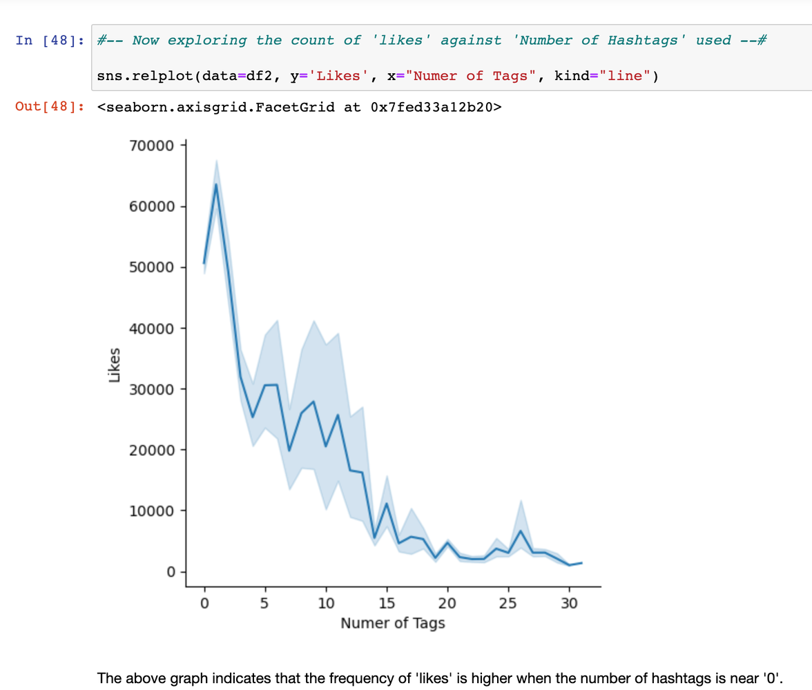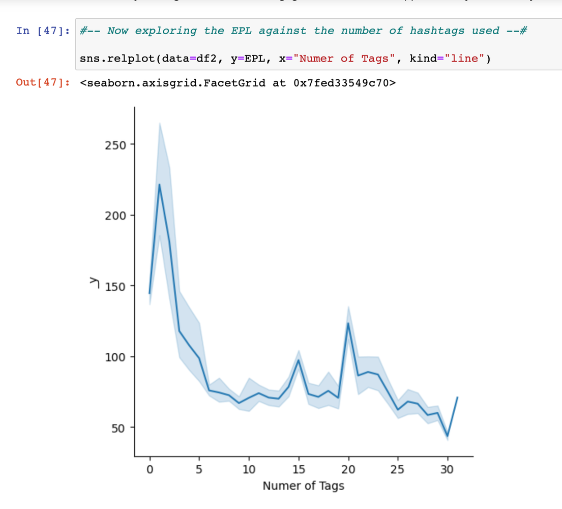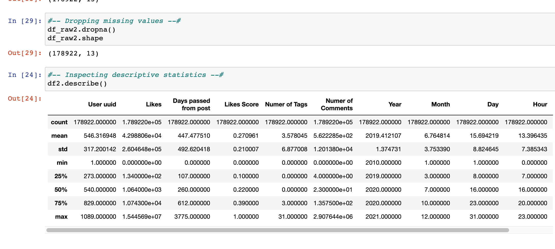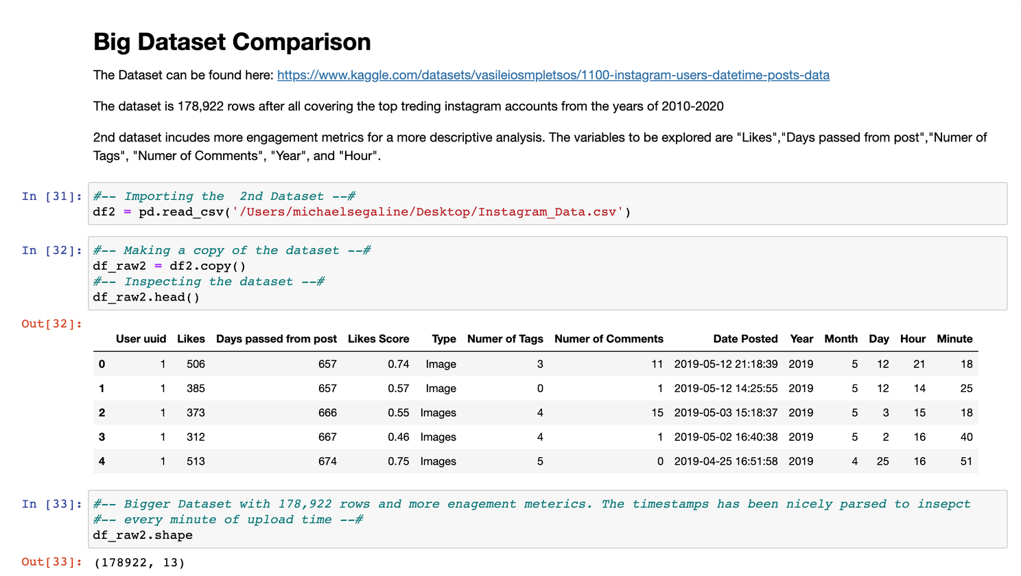 Available to the public via Kaggle.com, meaning that the dataset may be limiting in accuracy and completeness. The second dataset is 178,922 rows and 13 columns. It covers 10 years of trending Instagram content with upload times. The dataset has ‘likes’, ‘comment count’, ‘days past from post’, ‘day’, ‘number of tags’, ‘days past upload’, ‘day’, and ‘hour’. It has numerous columns for exploration and two variables that can be engineered into a more refined engagement metric ‘likes’ can be filtered through the ‘number of comments’; Yielding a more descriptive metric called Engagement Per Like EPL. The dataset can be found here: