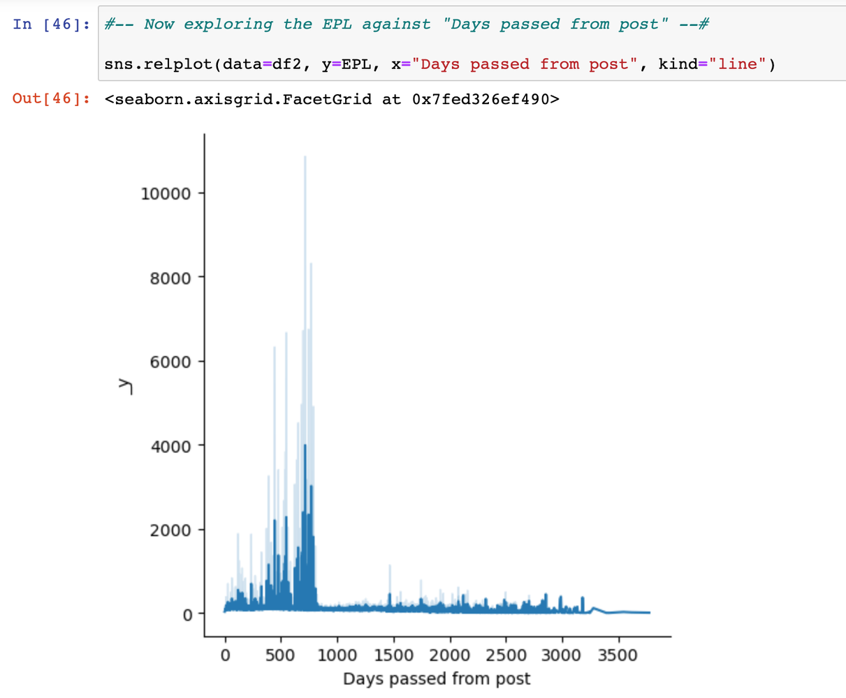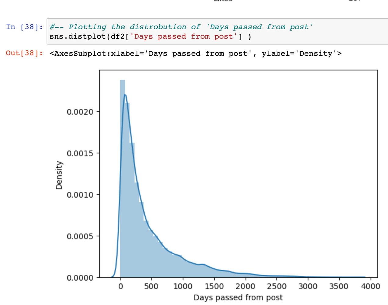 The above graph shows in that content engagement peaks and drops dramatically after the 600-800 day mark. The distrobution seems to imply that engaging content, will be ‘more engaged with’ approximently with in 300 – 500 days after upload.