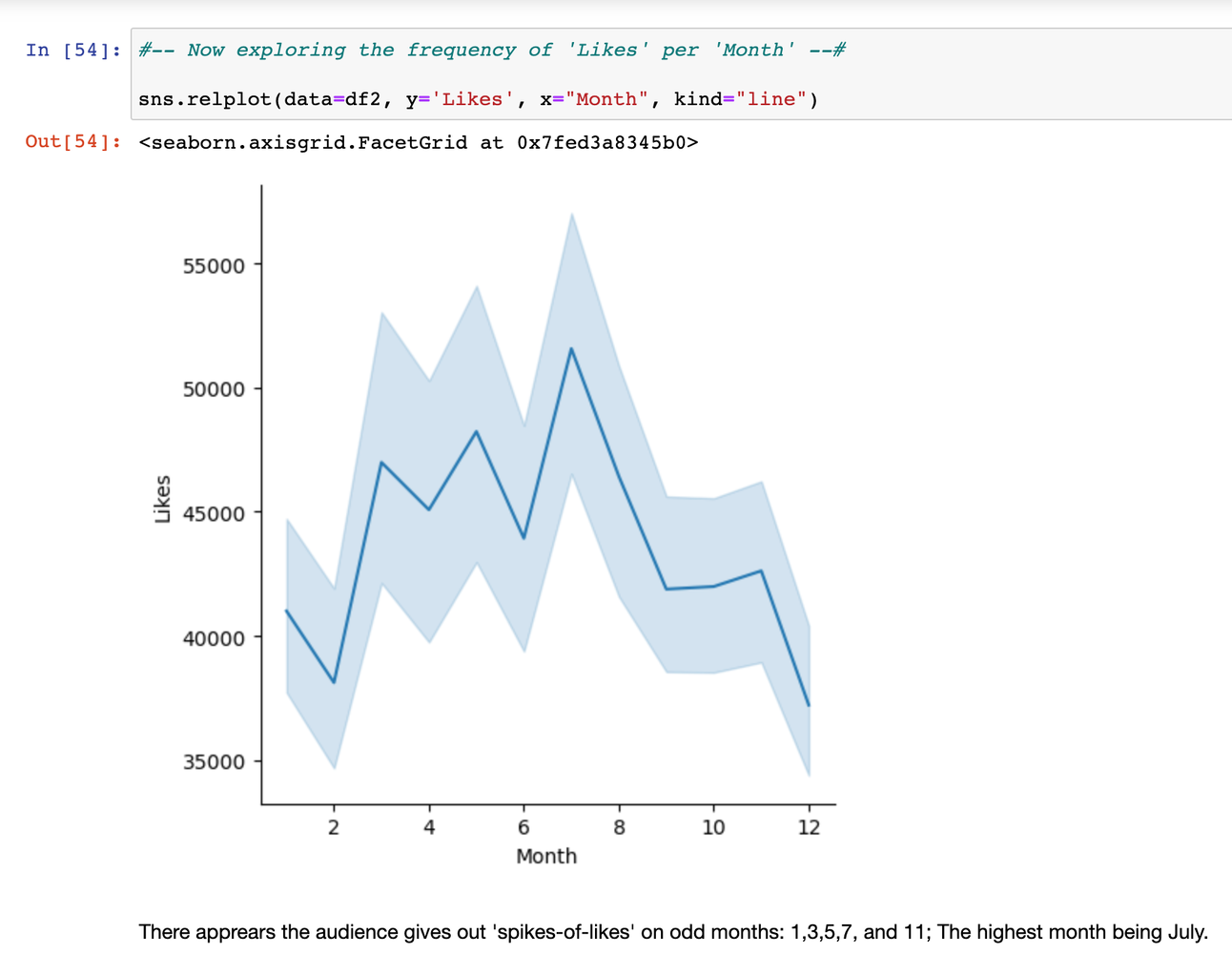 There appears the audience gives out ‘spikes-of-likes’ on odd months: 1,3,5,7, and 11; The highest month being July.