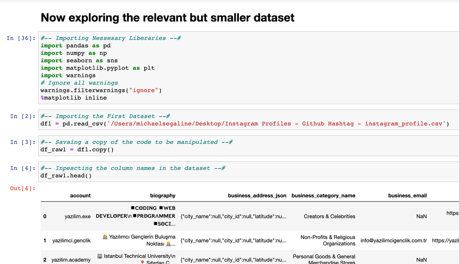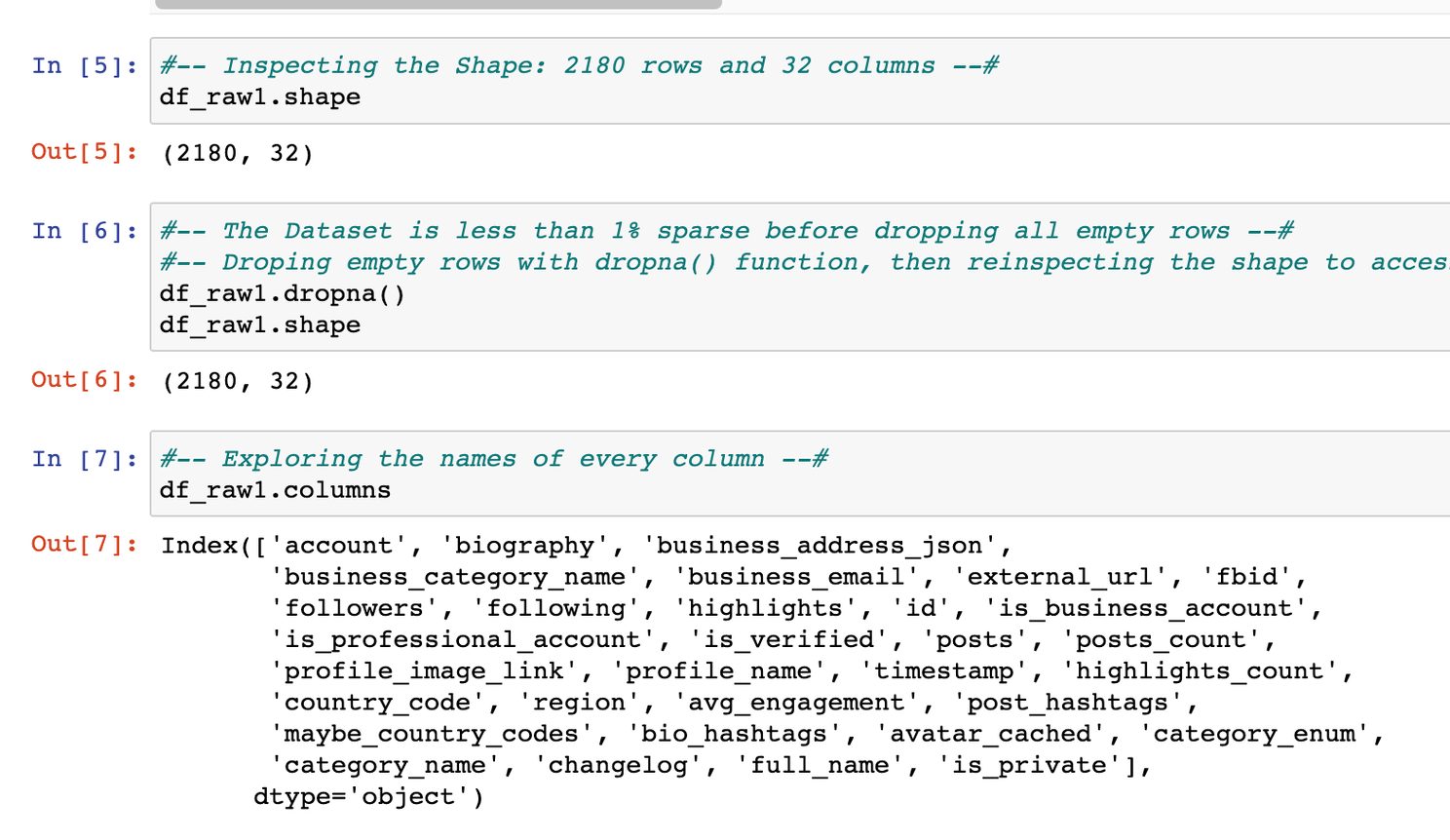 Plan and direct data gathering to opensource repositories (Google). Looking for keywords such as “Instagram”, “upload times”, “+ .csv”. Next, selecting the 1st to 3rd ranked piece of content (reachable csv file) and inspecting each csv file for quality such as “length” (at least 7k rows combined), data cleanliness, massive gaps in data, and enough relevant variables to create an ‘X’ and ‘Y’ axis. Another consideration was finding two datasets, (1) big and (1) pertinent to compare the differences. Available to the public via Kaggle.com means that it may be limiting in accuracy and completeness. Fortunately, all dependent variables are continuous. The relevant set is 0.01% sparse and all missing or null columns will be dropped when cleaning the dataset. The ‘upload_time’ will be separated from the date into separate column of upload hours for the smaller dataset. The large set is 0% sparse and requires no complex feature engineering.
