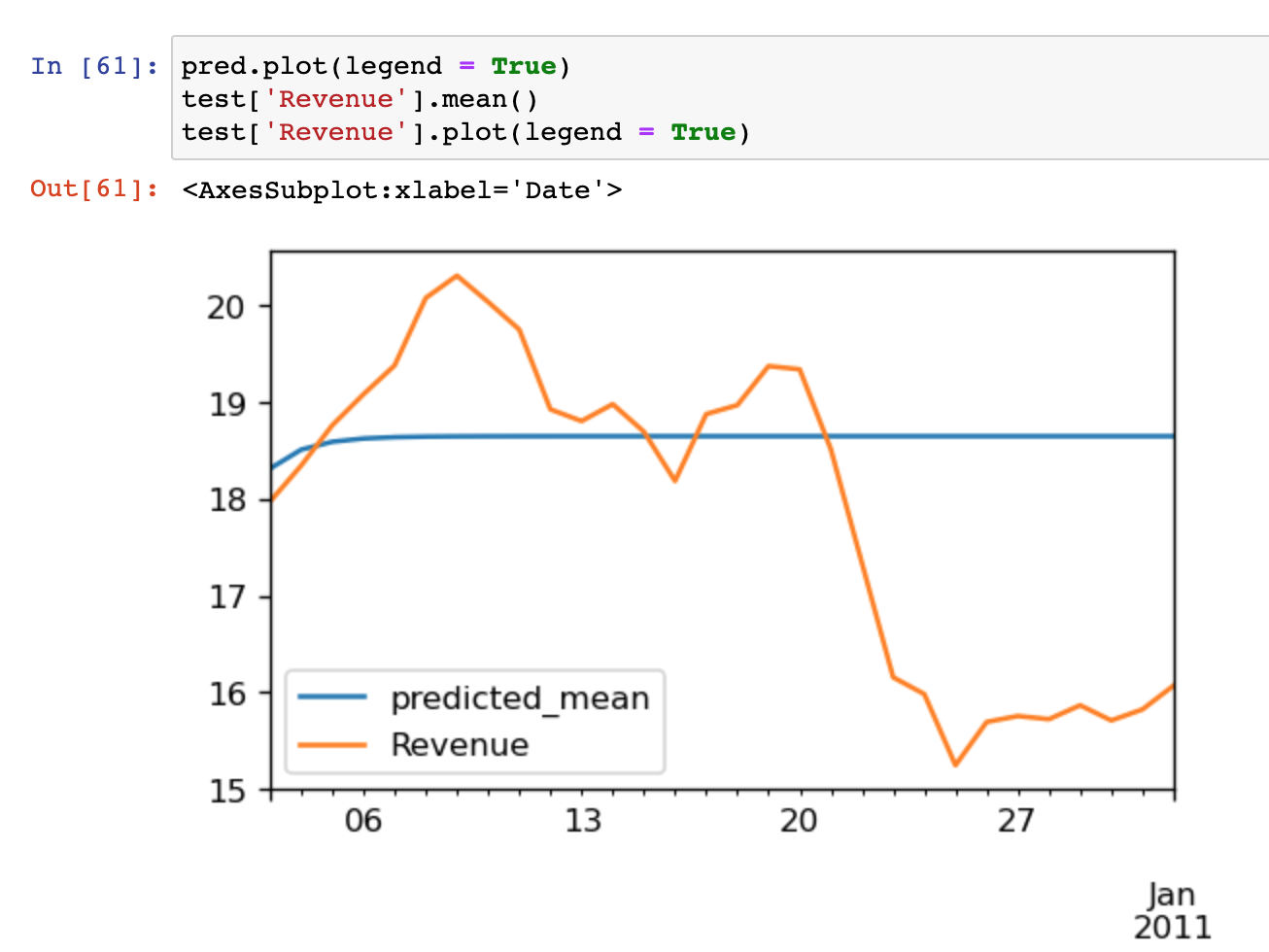 Below is the visualized forecast from a derived ARIMA model when compared with the test data: