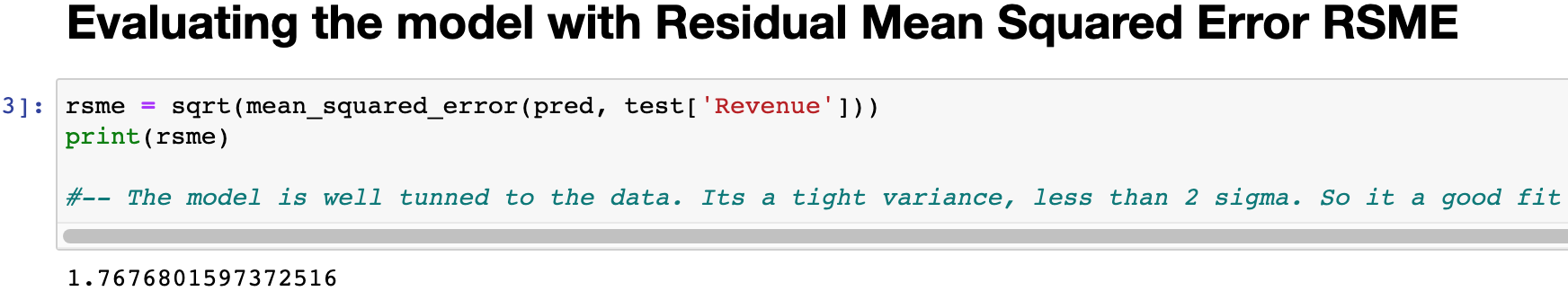 A Residual Mean Square Error of 1.76 indicates a very tight-fitting model to the dataset and correlates with the less than 2 Sigma deviance. Given that, the below predictions are reliable at a 98% confidence.