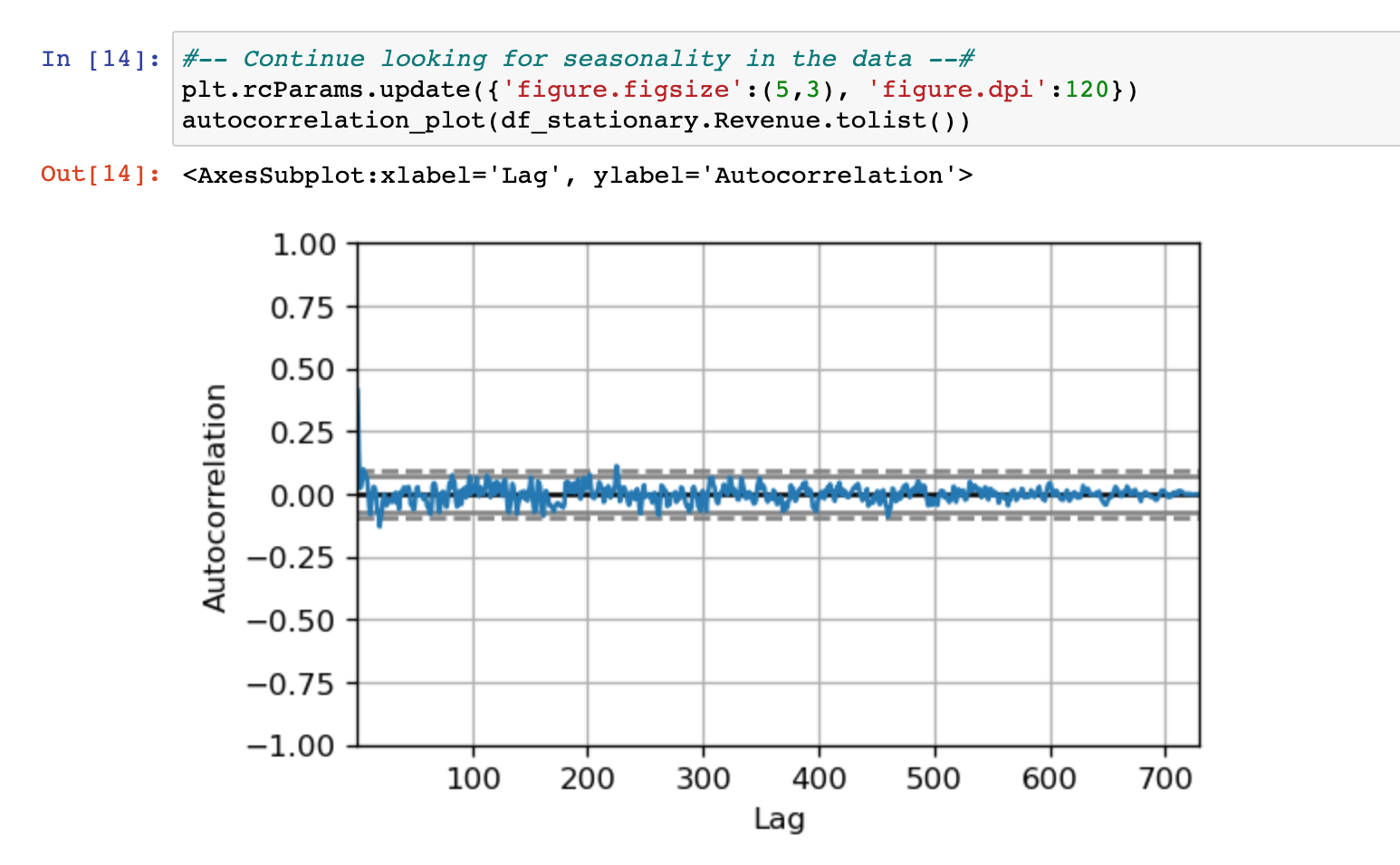 Further inspection for seasonality with measures of central tendency in the time series when visualized with an autocorrelation_plot(); The result is a tight variance in the residuals and appears to tighten around 0.0. The following visualizations also indicate that there is no clear repeatable cycle.