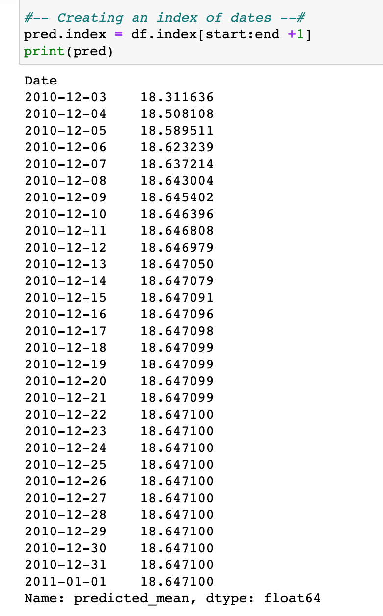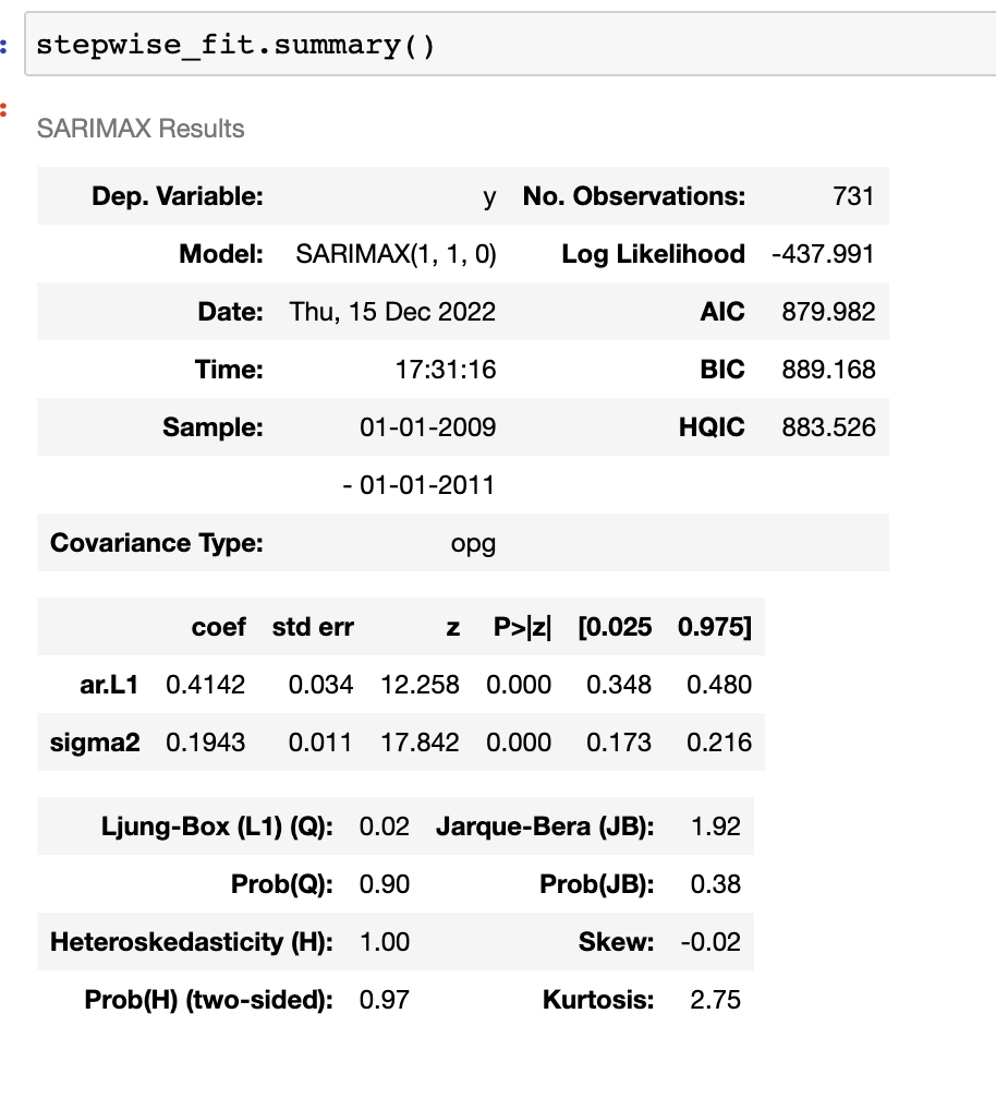 After passing the (non-differenced) data into an auto_arima() the best combination of P,D,Q for the model is (1,1,0), with the lowest AIC score. Since P and Q are cointegrated variables, only D, needs to be reconfirmed with the ADFuller test (Data Camp 2022).