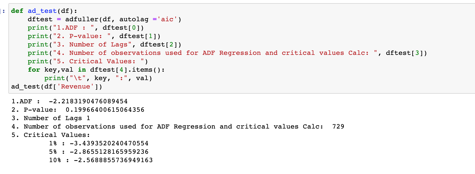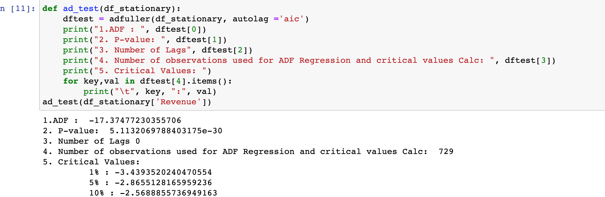 Stationarity was evoked after running differencing via .diff() method and retested via .adfuller(). Below is a photo of the retest, in which the ADF test statistic is higher than the critical values, therefore the data is stationary; Additional indication is the number of lags, 0.