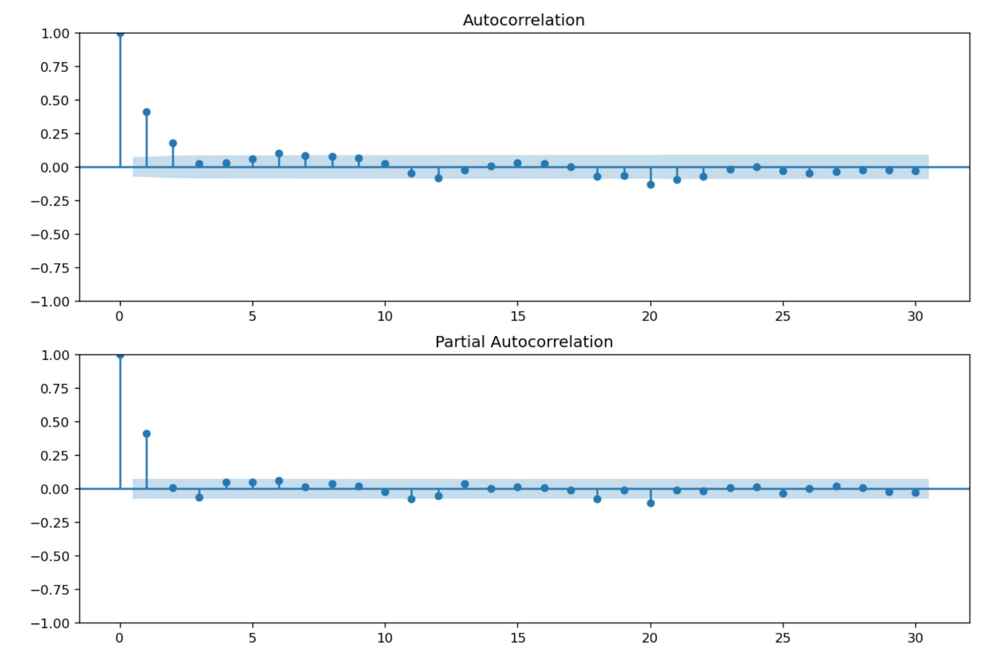 The Augmented Dickey-Fuller test is used to assess the stationarity of the data. If the critical values are less than the test statistic, then we have stationarity. When inspecting the absolute values of the ADF test statistic (2.21) and critical values at all percentiles are slightly higher. Slight seasonality because the Number of lags is 1 (variable ‘D’ for ARIMA) amongst 720 different observations.