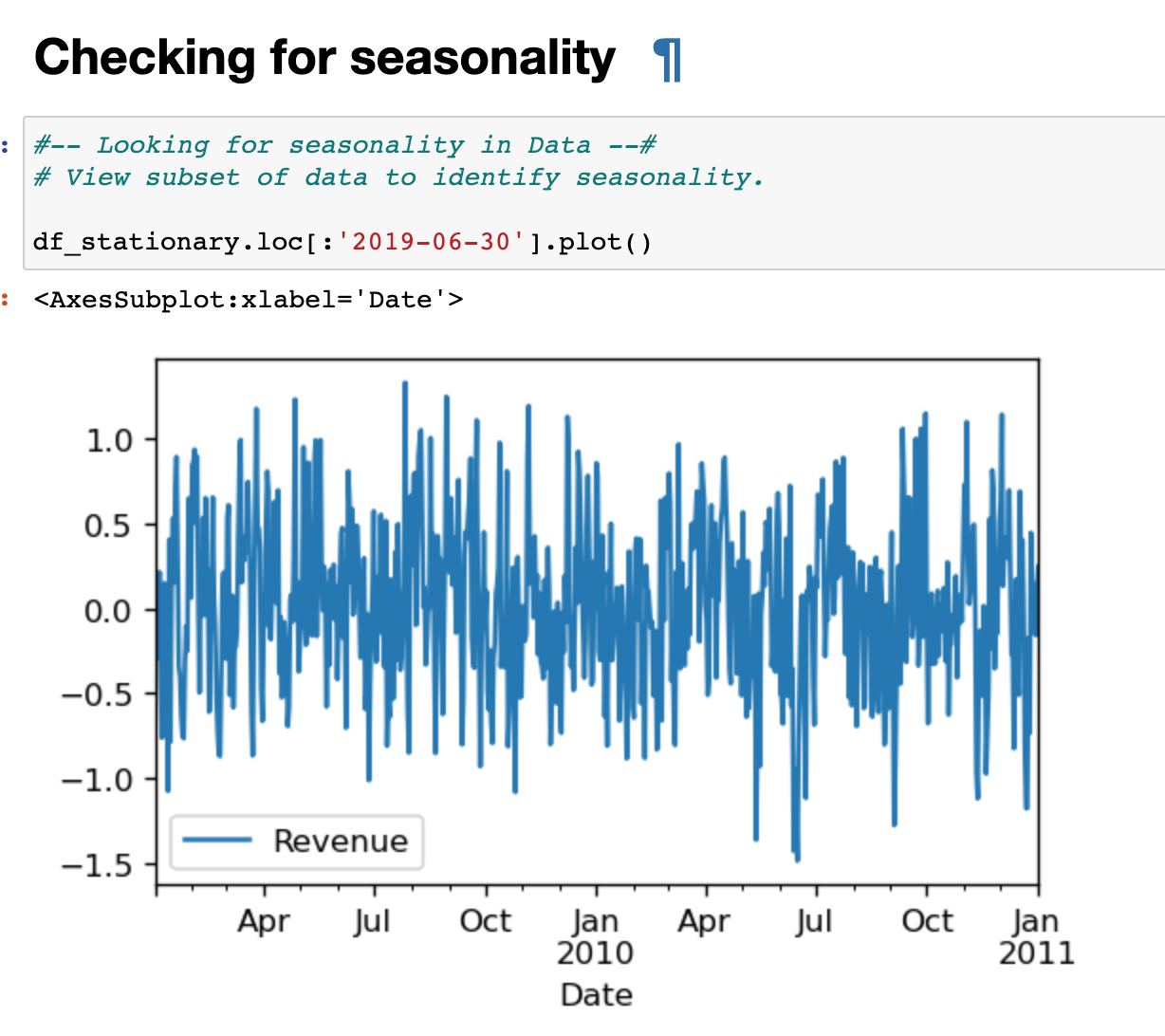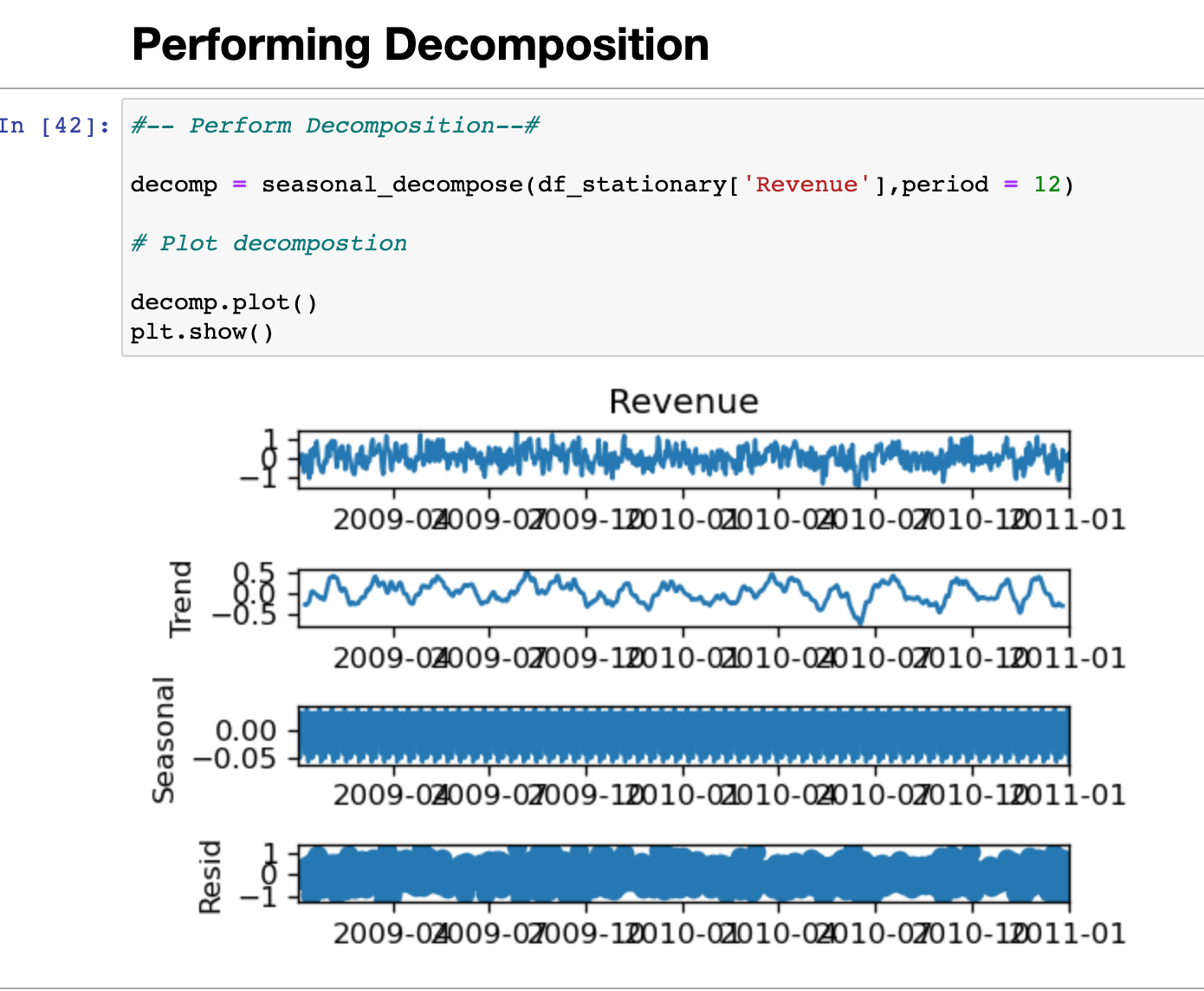 When fleshing out the data further with the seasonal_decompose() on a monthly scale, only normalized data is evident. The below picture shows the scales of Revenue, Trend, Seasonality, and Residuals.
