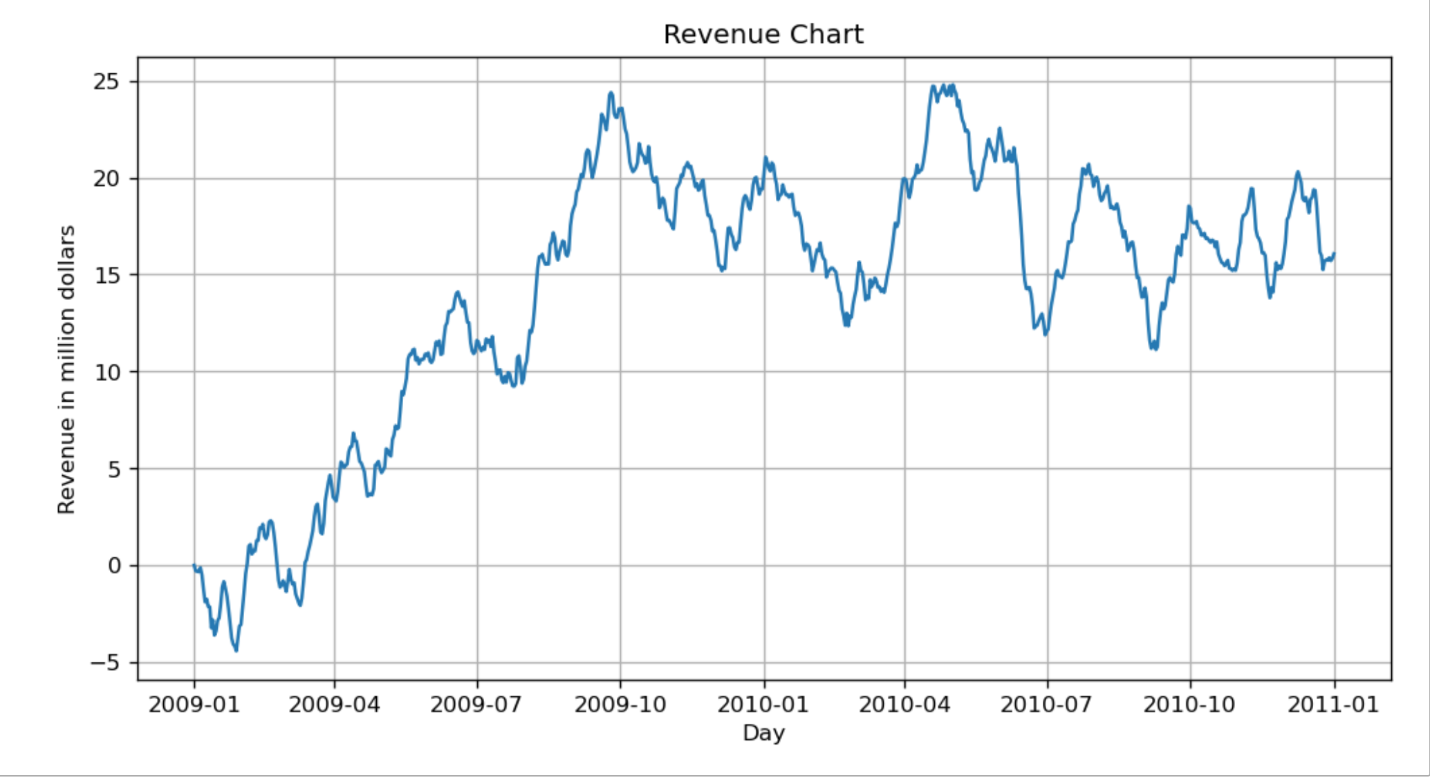 Below is a line graph visualizing the Times series of hospital revenue over the last two years and starting with an arbitrary date of “2011 -01-01”. The Graph shows the obvious trend in the data; The first visual indicator that there is stationarity.