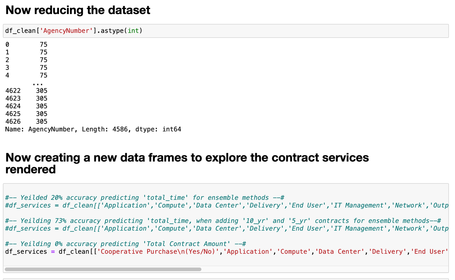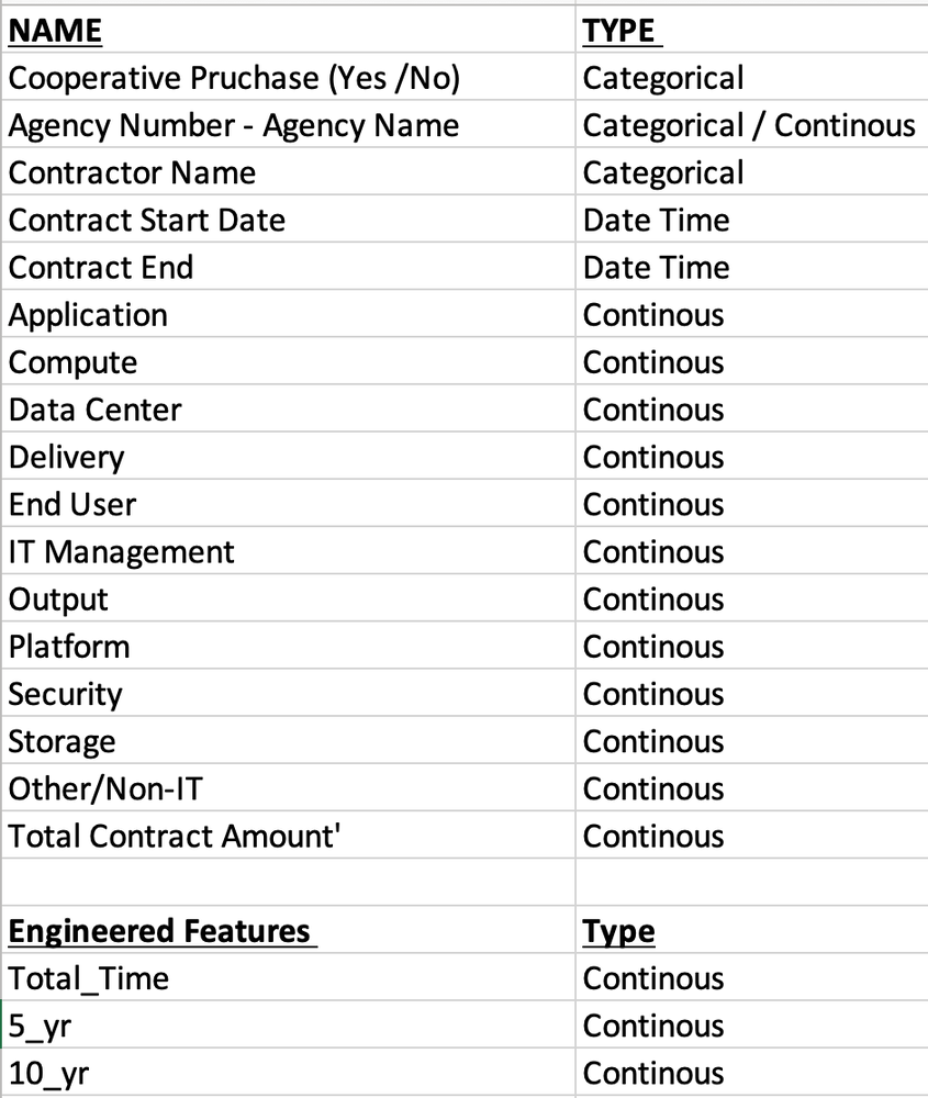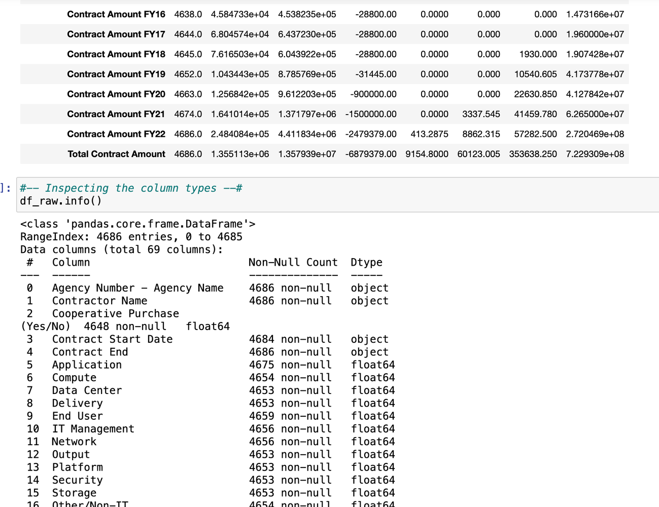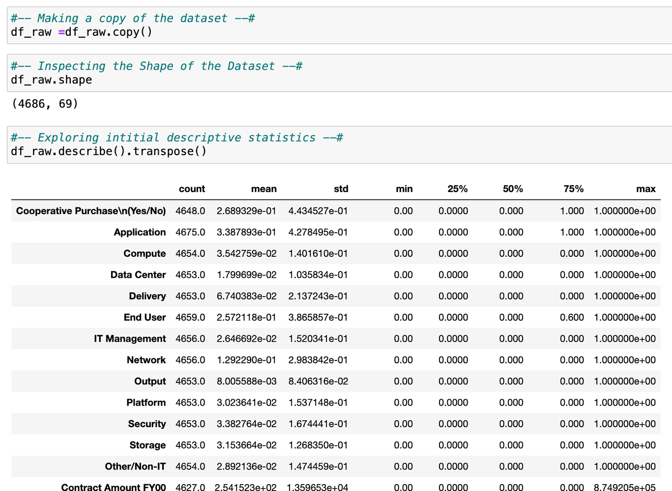 An open-source dataset of IT contracts awarded to companies by organizations under the State of Washington. Containing the necessary variables about agencies requesting service and the private agencies awarded the contract. A government dataset from Data.gov. Data.gov is the open-source government repository that hosts the datasets. The dataset contains almost 4,686 rows (before any rows where removed) and 69 columns. The dataset is limited to the metrics recorded. However, the dataset has multiple columns for possible exploration.