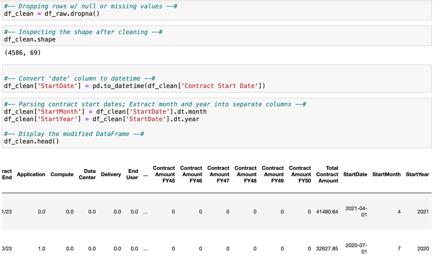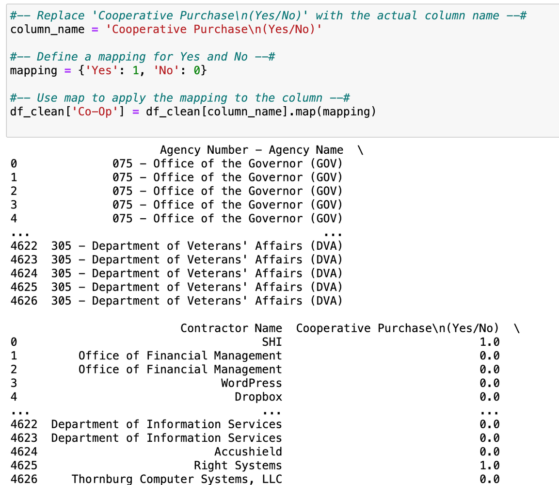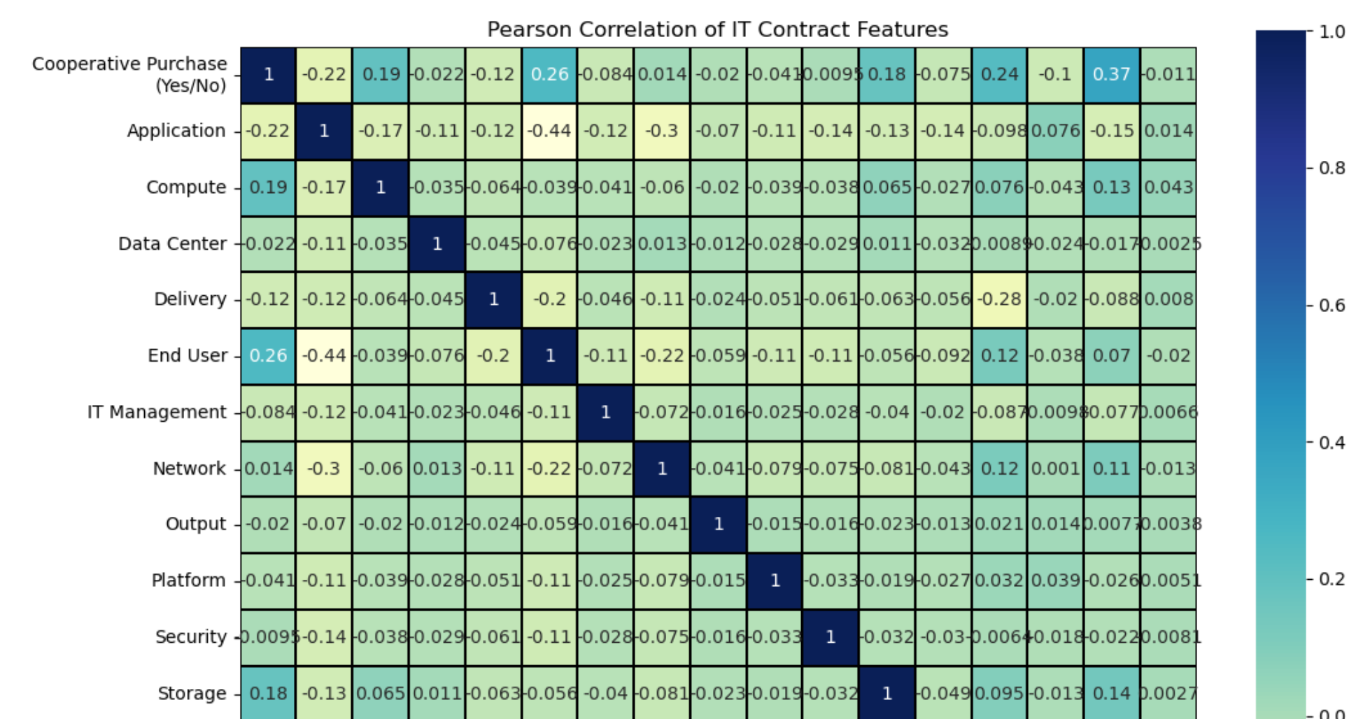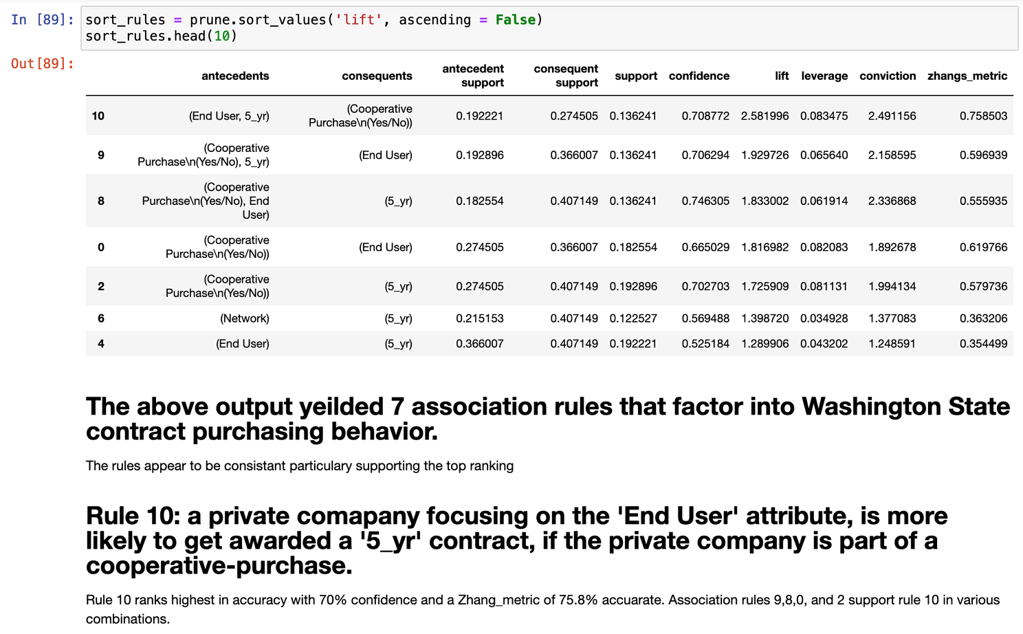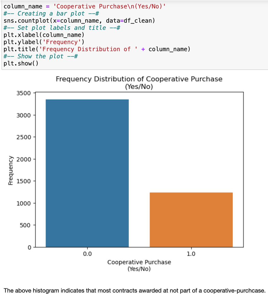 Various machine learning models, including Principal Component Analysis (PCA), K-Means Clustering, Random Forest Regressor, XGBoost, and Market Basket Analysis (MBA), were employed. Market Basket Analysis yielded significant association rules, notably Rule 10, indicating that private companies focusing on the attribute: ‘End User’ are more likely to be awarded a 5-year contract if part of a cooperative-purchase.