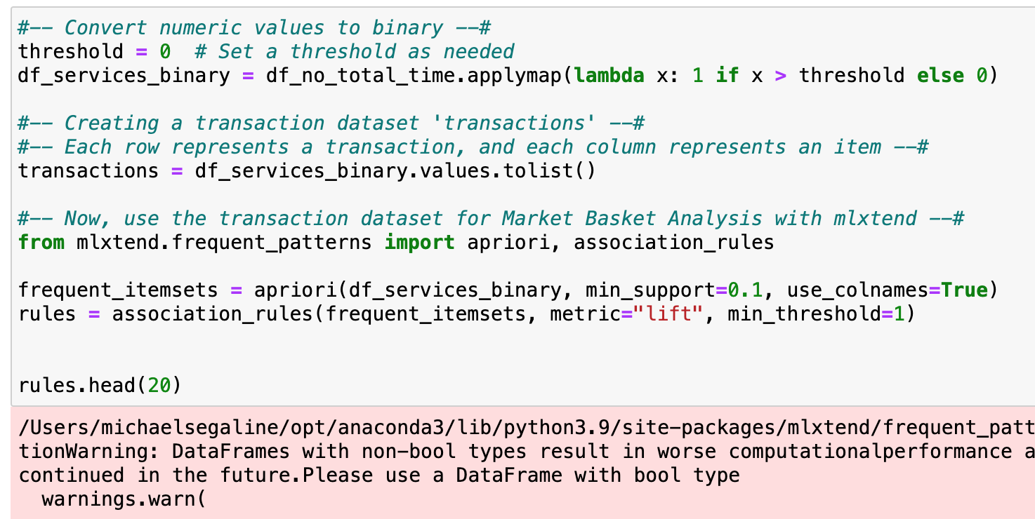 Python will be used for this analysis because of Numpy and Pandas packages that can manipulate large datasets (IBM, 2021). The tools and techniques are common industry practice and have consensus of trust. The technique is justified through the integer variables necessary to plot against a timeline. In so doing, may just reveal different modes of frequency distribution. Another reason why MBA test is ideal is because the data is based on purchasing behavior. Because of the size of the dataset, pandas and Numpy will be called. Python is being selected over SAS because the Python has better visualizations (Panday, 2022).