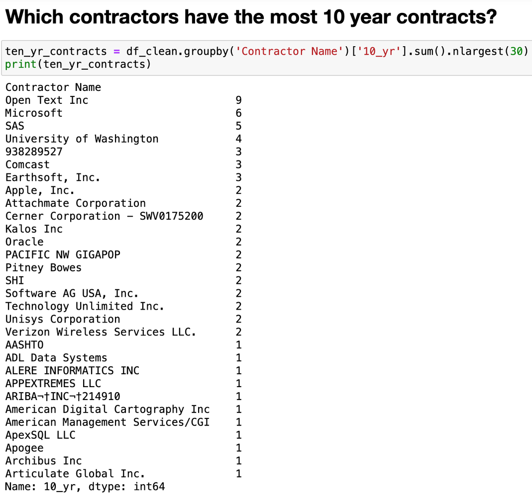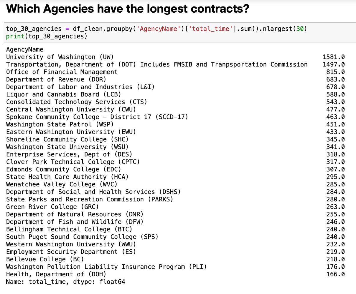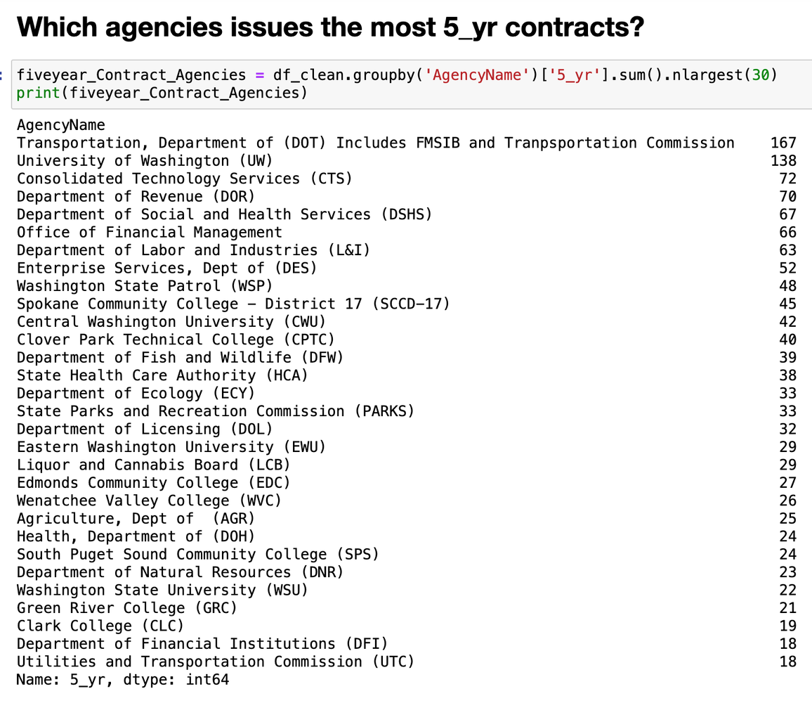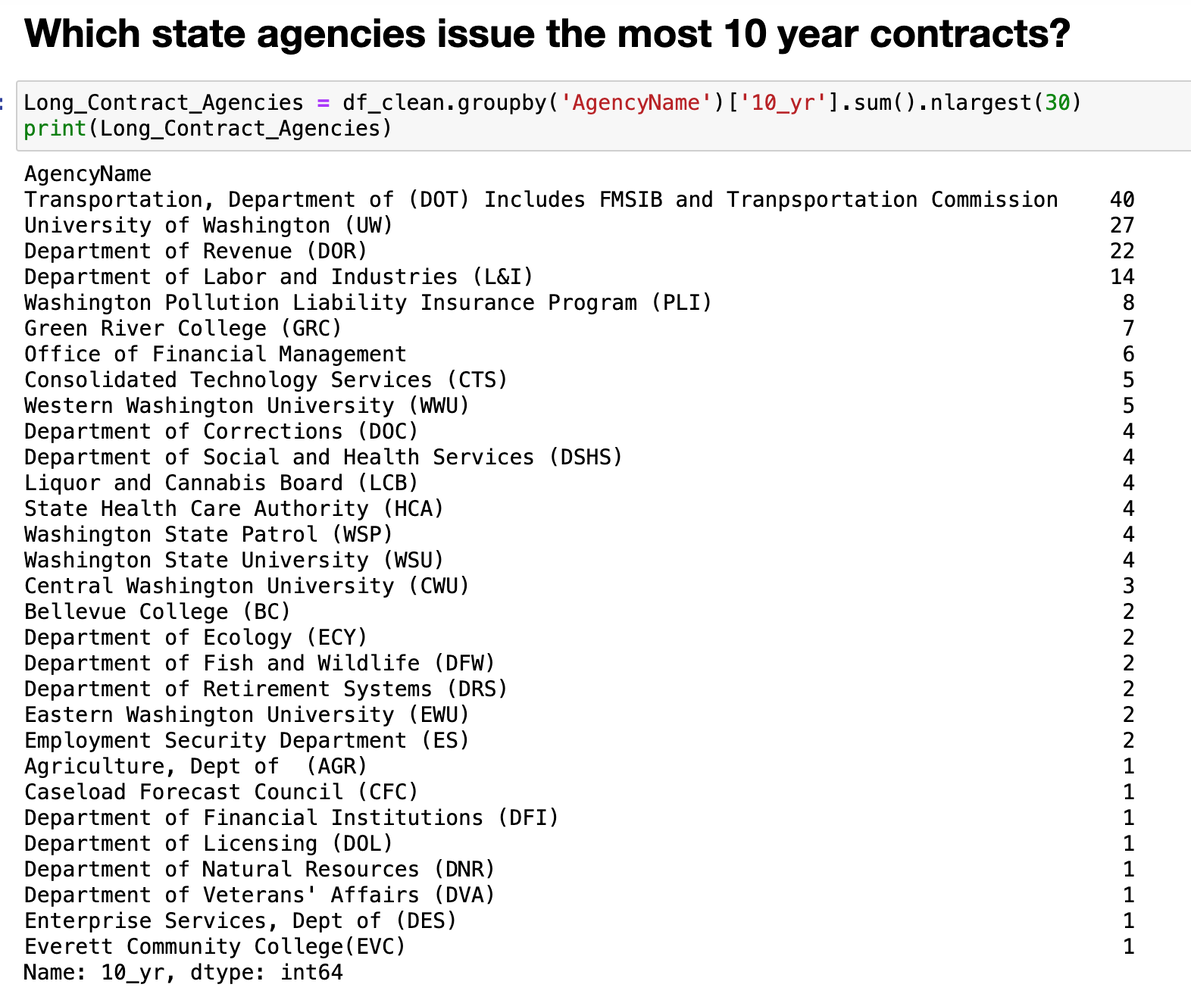 According to the outputs, Community Colleges and State Universities. It also appears the University of Washington is common issuer of contracts; At the same time, a contract winner for 10-year contracts.