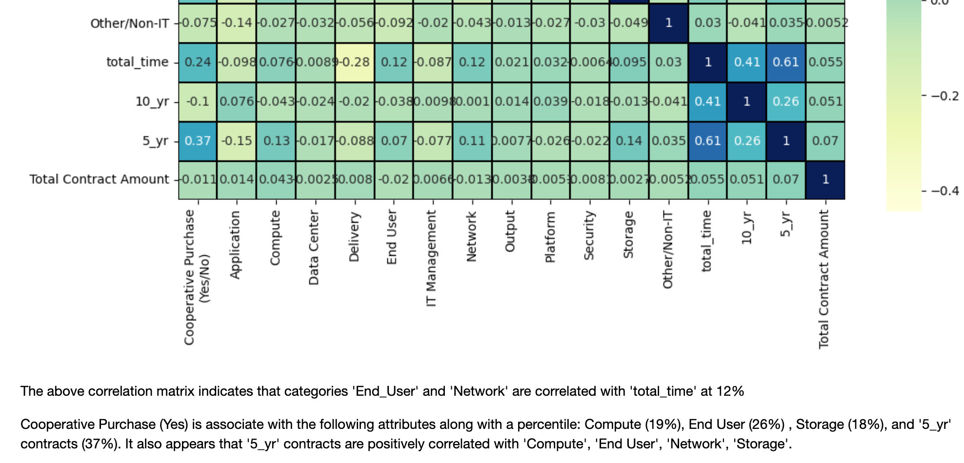 The distribution of contracts is non-random, with most starting in 2020 and July being a common start month. Correlation analysis reveals associations between ‘End_User’ and ‘Network’ with ‘total_time’. Cooperative purchases show higher ratio of ‘Total Contract Amount’ and longer contract durations.