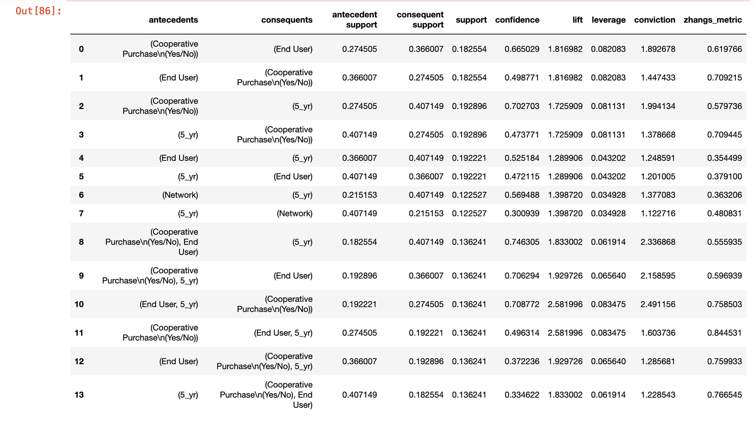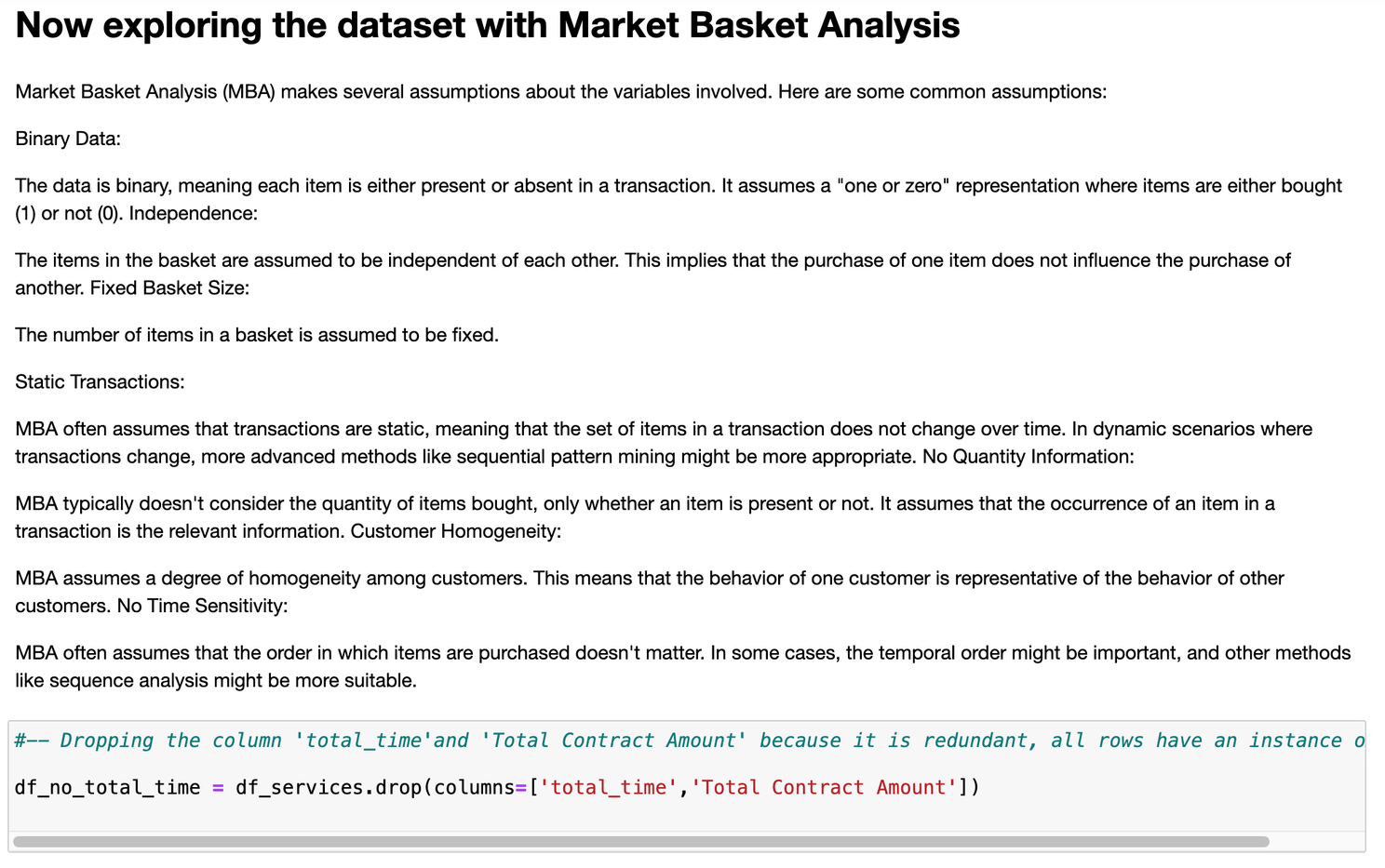 Project Outcomes: To find statistically significant differences, the proposed end state is to answer the research questions and provide a Market Basket Analysis statistical model that can create association rules between co-occurrences of purchasing software contract attributes (Statology, 2019). A visualization of the frequency distribution of the independent variables and a cleaned dataset of all the correctly labeled columns and rows, for replication. A better understanding of previously stated groups with exploratory graphs, giving support as to the model expectations. Lastly, a copy of the Jupyter NoteBook with the Python code will be available, along with a video presentation. According to the same study MBA was instrumental in support for alternative hypothesis, against other categorical variables (USDA, 2020).