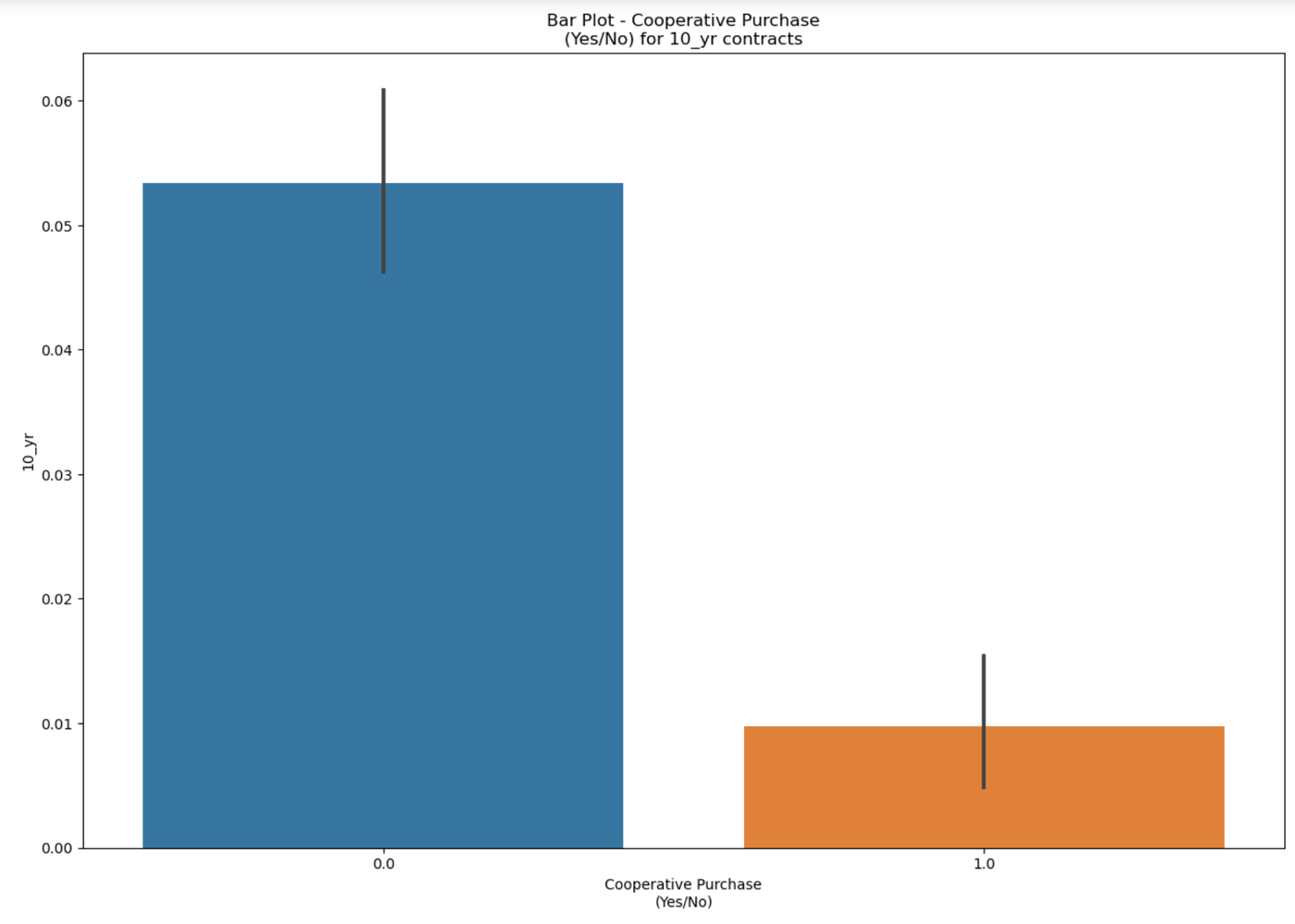 The below graph shows the frequency of Cooperative Purchase is significantly greater for 5-year contracts. Indicating that Cooperative Purchases have a higher average of ‘Total Contract Amount’ compared to Non-CoOp. While Non-CoOps have significantly more 10-year contracts. The inverse is true for 5-year contracts.