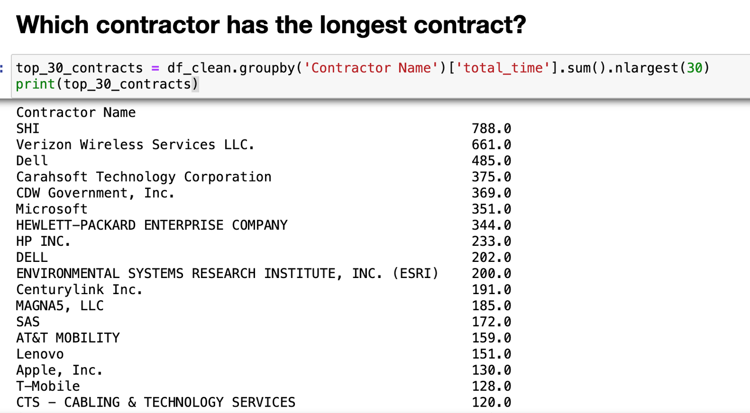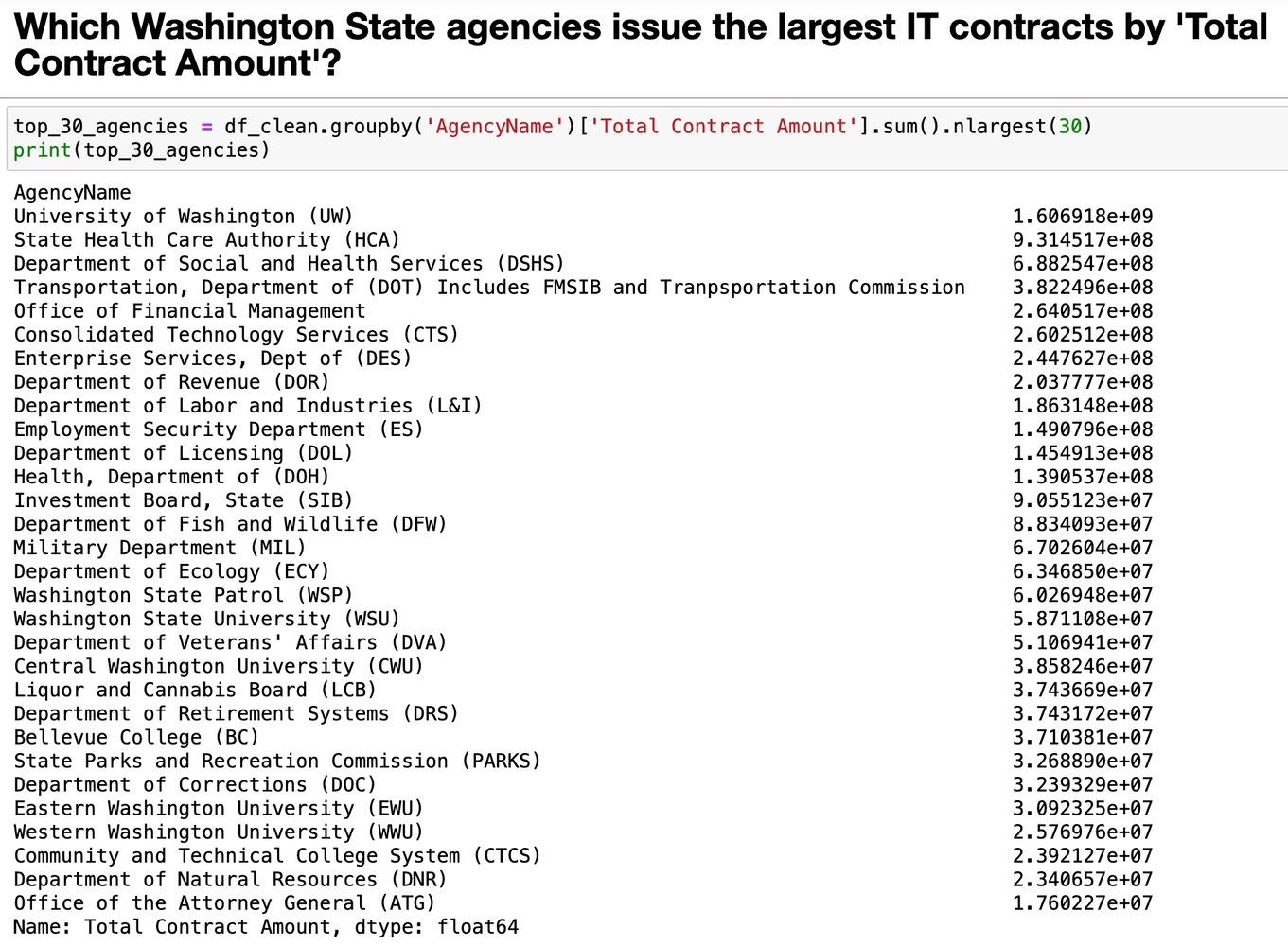 According to the outputs, Community Colleges and State Universities. It also appears the University of Washington is common issuer of contracts; At the same time, a contract winner for 10-year contracts.