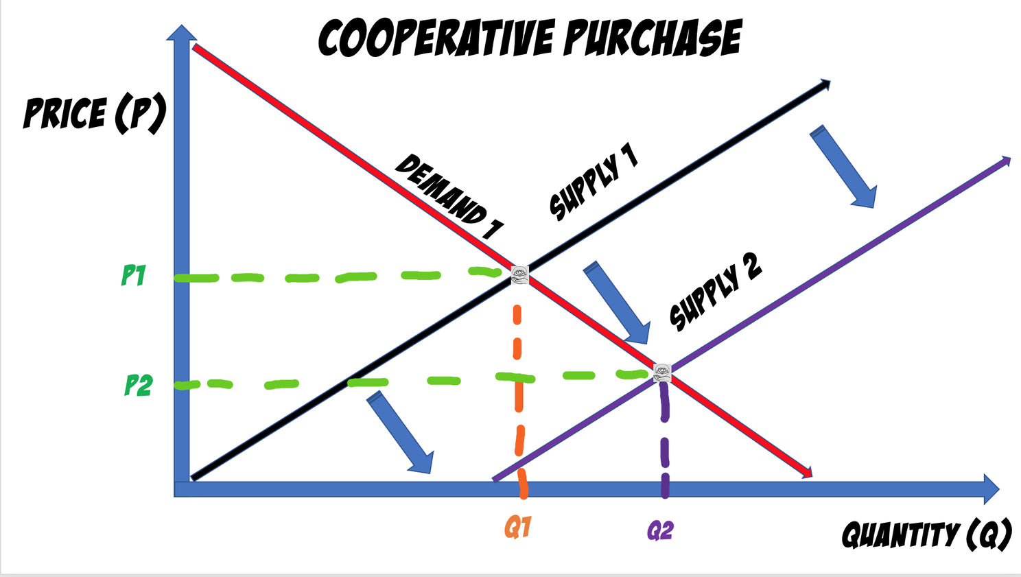 The below graph showcases what happens when the government conducts cooperative purchases on behalf of the taxpayer to get a cheaper price point ‘P2’ and a higher quantity ‘Q2’.