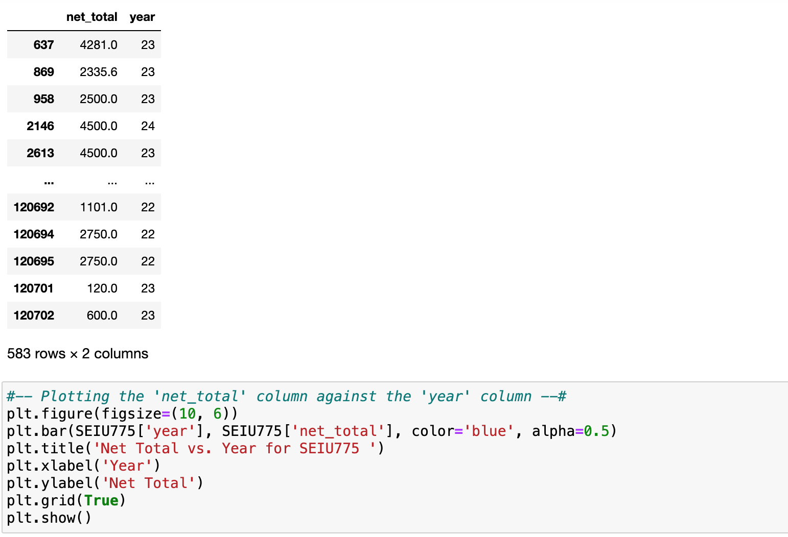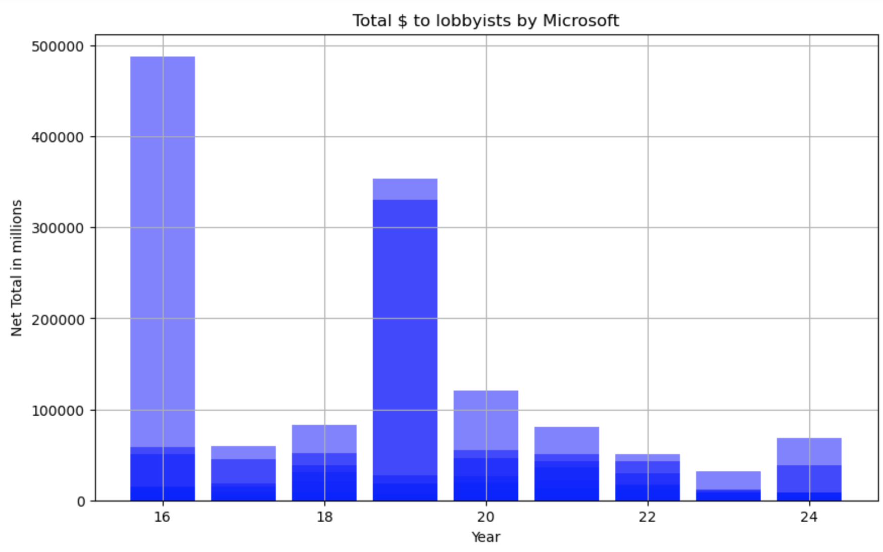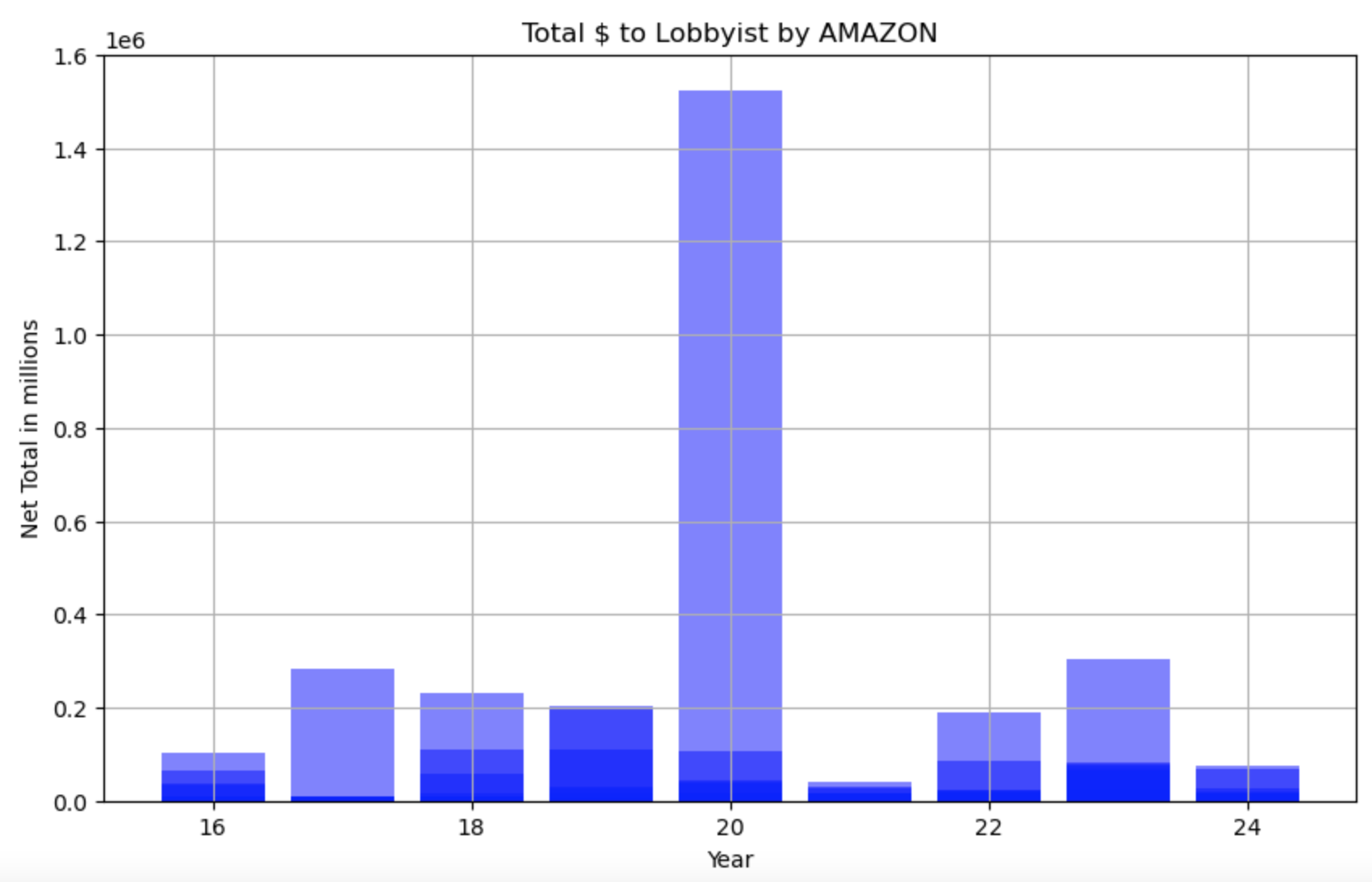 However, despite the observed increase in frequency, the analysis reveals that the ‘net_total’ of lobbyist donations does not exhibit a corresponding increase over time. Instead, it remains random, suggesting fluctuations and inconsistencies in the overall financial contributions made by lobbyists.