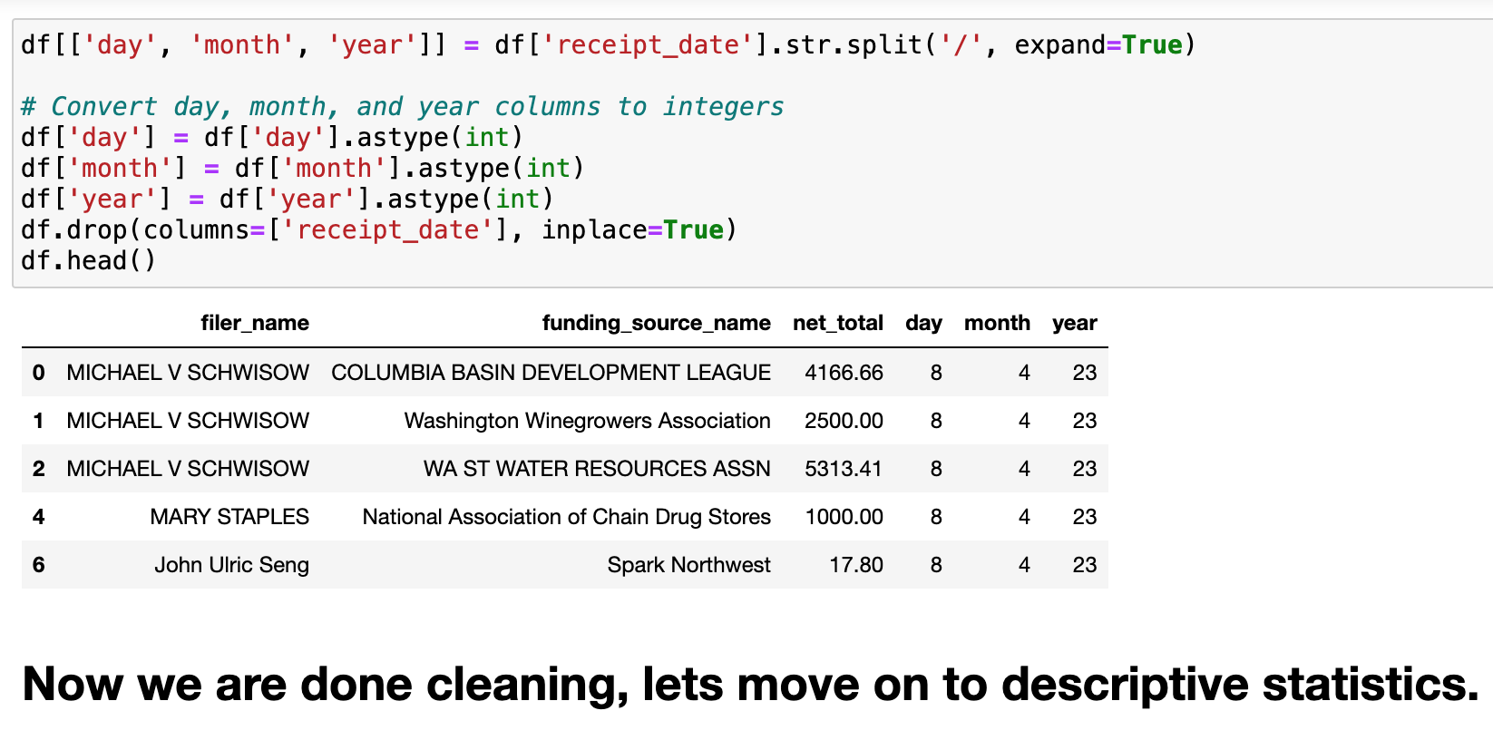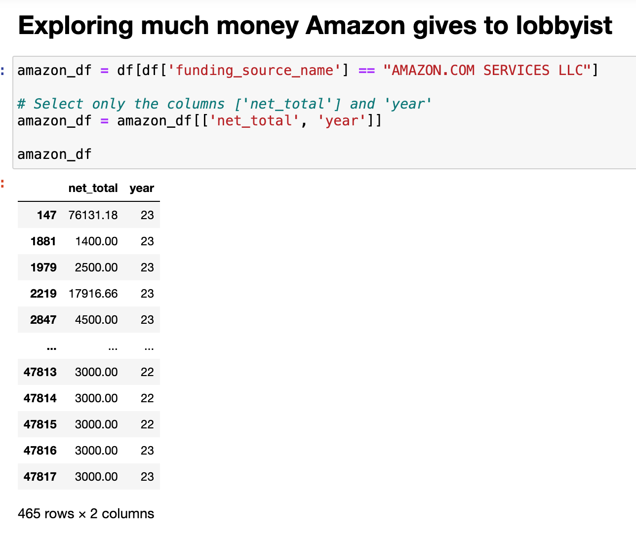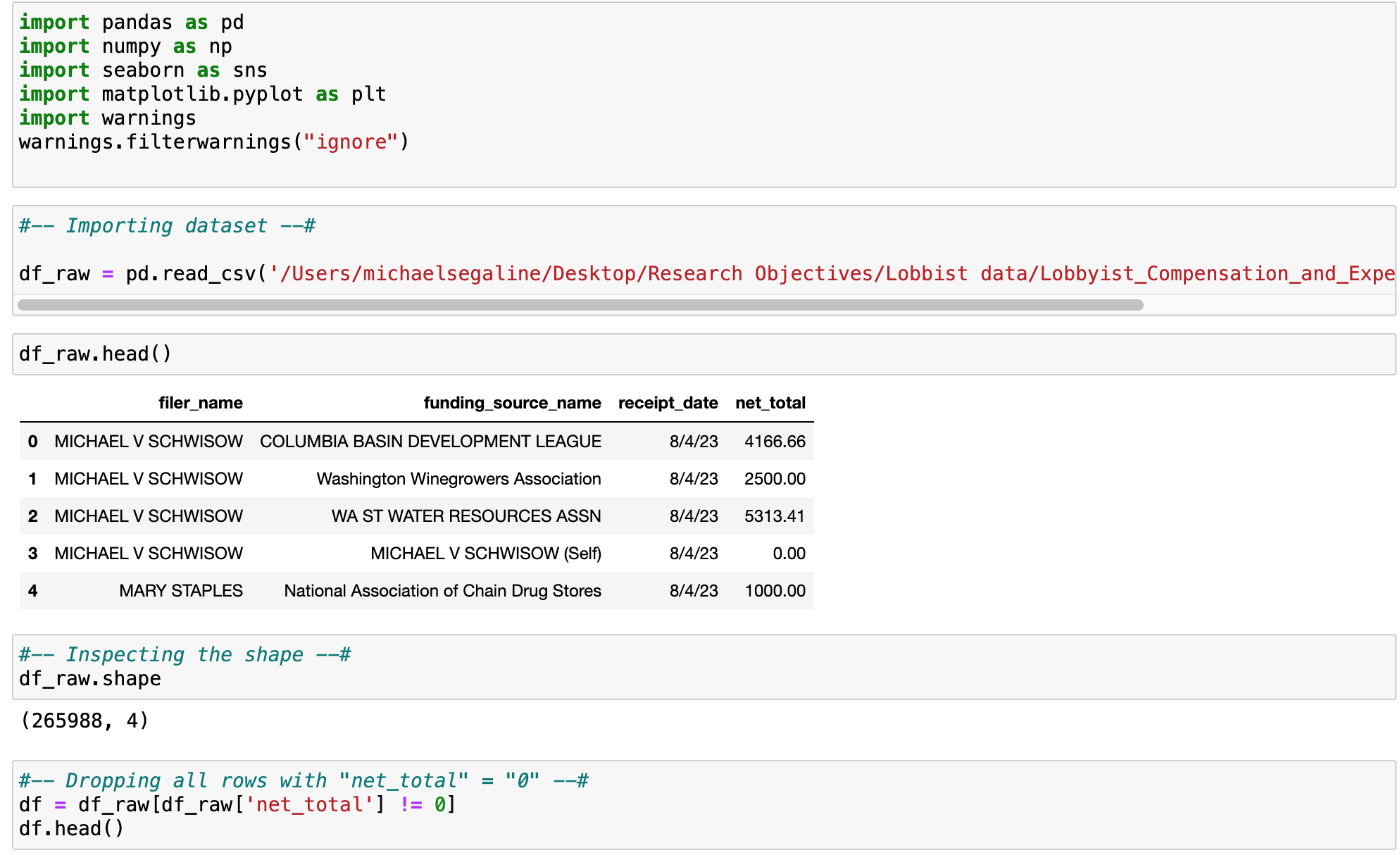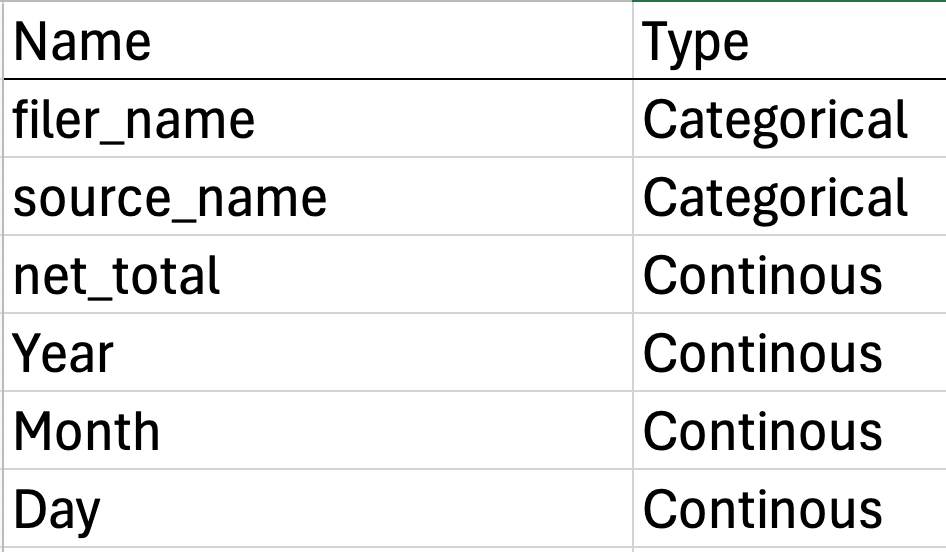 For analysis, is an opensource dataset of lobbyist donations data containing the necessary variables from Data.gov. Data.gov is the opensource repository / organization that hosts the datasets. The dataset contains almost 265,988 rows (before any rows where removed) and 27 columns. The dataset is limited to only 8 years of lobbyist funding; Recorded from 2016 and going to 2024. The dataset has multiple columns for possible exploration. Different source-agents disseminate different amounts of money to lobbyist. Delimitations for this analysis, only 5 columns of the dataset will be used as they factor. The ‘Year’, ‘Net_total’, ‘filer_name’, ‘source_name’, ‘Month’, and ‘Day’; The ‘Date’ column will be parsed into separate columns. Limitations of the study size is only 8 years of data. Moreover, delimitations of the 27 IVs, only 6 will be explored.