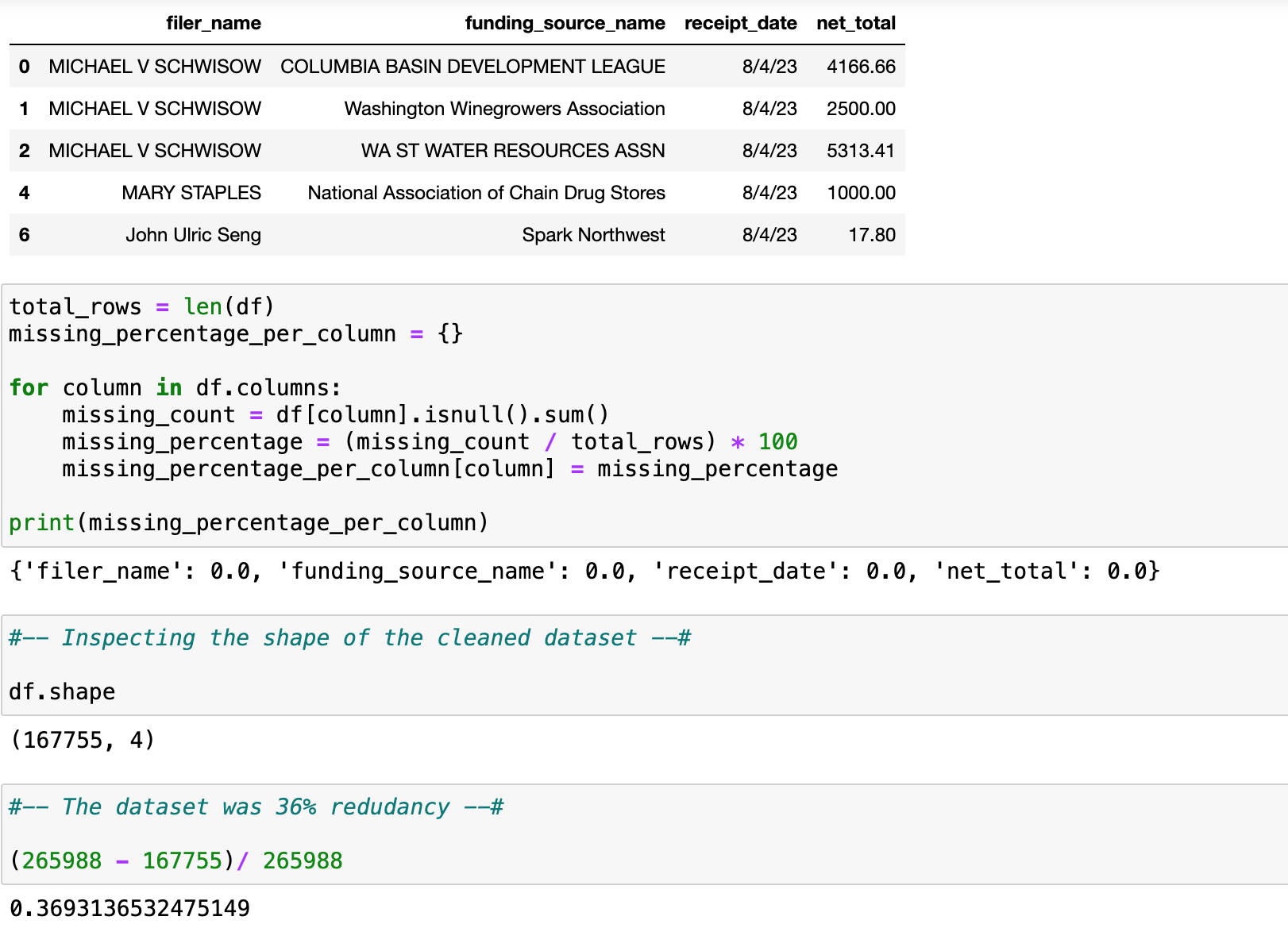 Plan and direct data gathering to opensource repositories (Google). Looking for keywords such as “Washington State”, “Lobbyist”, “Data”, “+ .csv”. Next, selecting the 1st to 3rd ranked piece of content (reachable csv file) and inspecting each csv file for quality such as “length” (at least 7k rows), data cleanliness, massive gaps in data, and enough relevant variables to create an ‘X’ and ‘Y’ axis. Available to the public via Data.gov means that it may be limiting in accuracy and completeness. In Random Forest, the dependent variable does not need to be a continuous (interval or ratio) level of measurement (Statology, 2019). Fortunately, all dependent variables are continuous. The dataset contained 36.9% redundant or repeat information before removing duplicates. All missing or null columns will be dropped when cleaning the dataset. The ‘Date’ will be separated in Python.