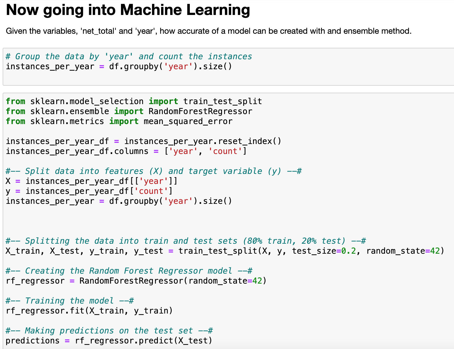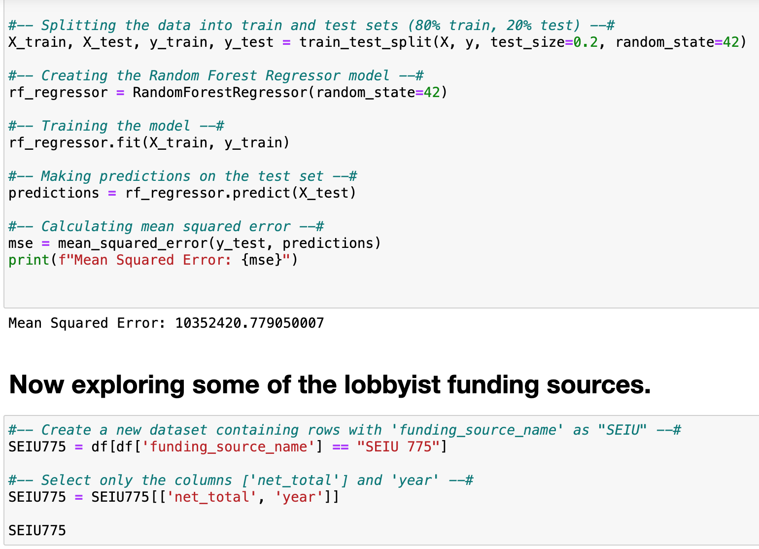 The below Random Forest Machine Learning Model was produced to predict the ‘count’ of lobbying ‘instances_per_year’. However, the Mean Squared Error MSE is 10,352,420; A very inaccurate scoring model, considering that the MSE should be as close to ‘0’ as possible. An identical Random Forest was used to predict the ‘net total’ per ‘Year’; However, that model yielded a very inaccurate score as well, but reenforces the random distribution of ‘net total’.