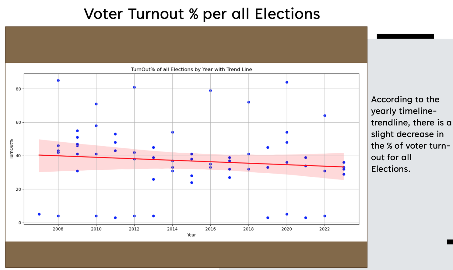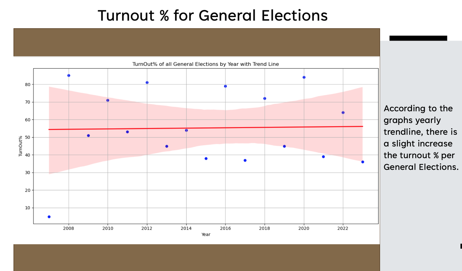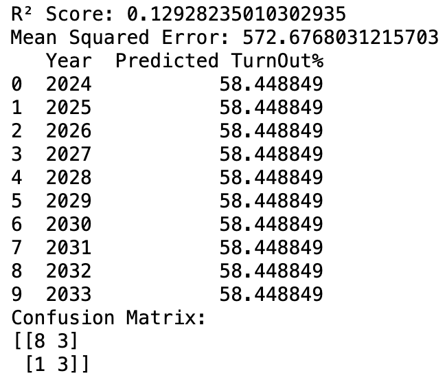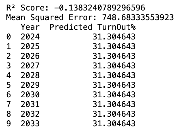 Below is the results for the Random Forrest model to predict voter TurnOut%, for General Elections, year over year, for the next 10 years for . The model is inaccurate and has produced an overfit prediction do to a small sample size. Notice that the TurnOut% does not increase year over year. The output has an R2 score of 0.12 when it should be as close to 1 as possible; Additionally a Mean Squared Error of 572.67, when the MSE should be near ‘0’. These scores lead to accepting the Null Hypothesis that VoterTurn% cannot be predicted because it is random with in a continuous distribution.