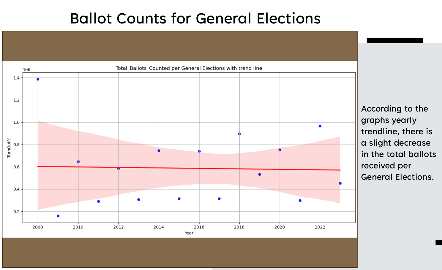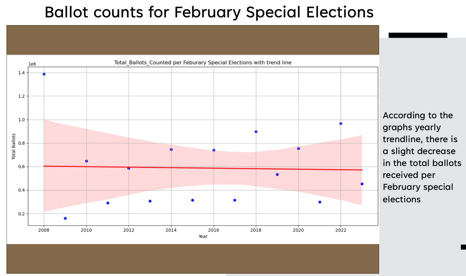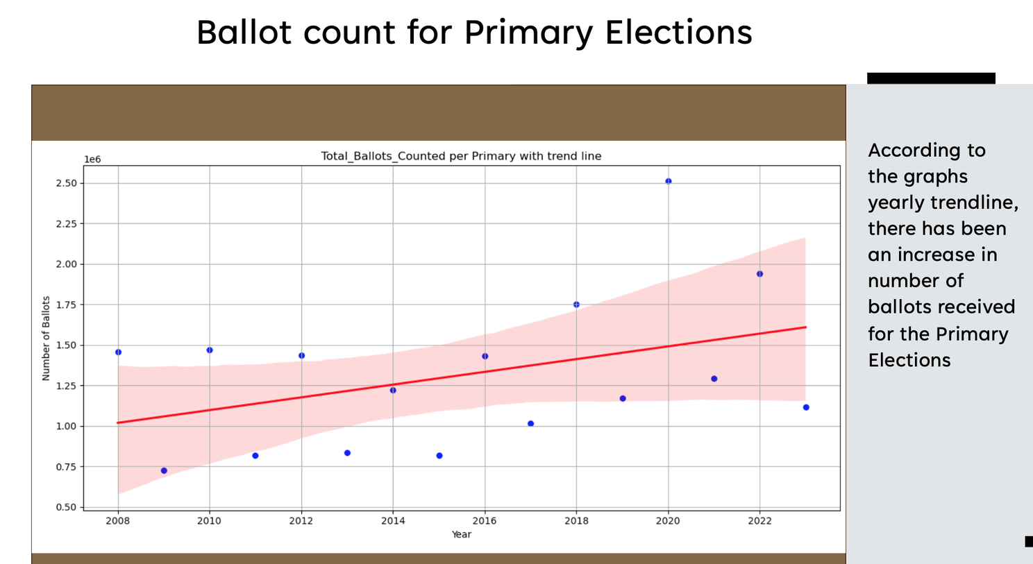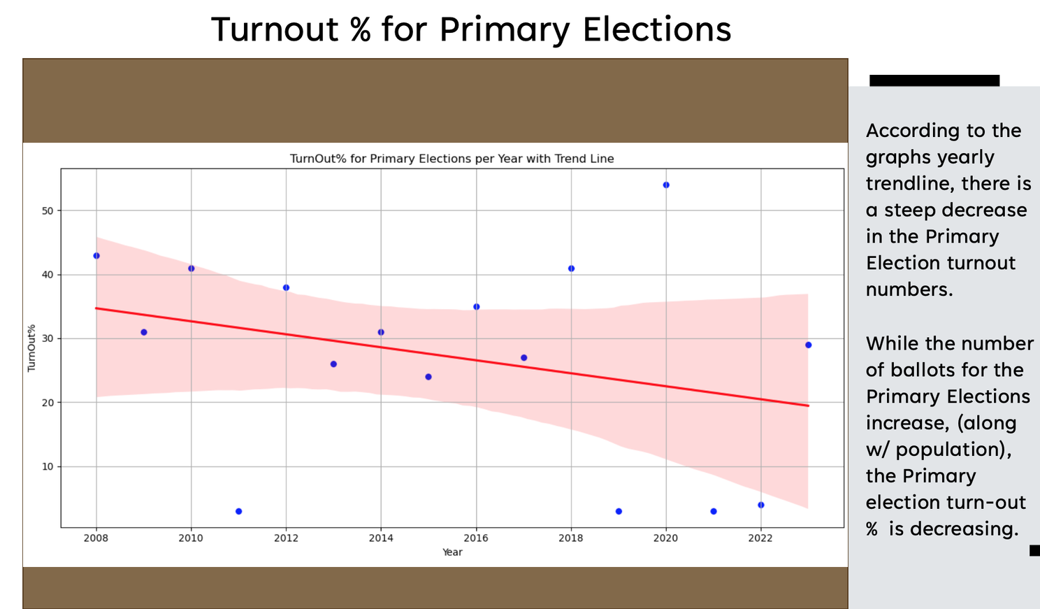 In final analysis, according to the results of the Random Forrest predictive test, we accept the null hypothesis that Washington State voter behavior is random and not predictable. The result appears to be that of overfitting in the data, meaning that is cannot generalized well on unseen data. Overfitting is most likely the case due to the small size of the dataset to begin with, only 73 rows; Representing all elections from 2007 to 2023. The distribution of voters is a continuous distribution between 0 and 100. The average turnout percentage is highest for General Elections at a constant rate of 52%. However, as the number of registered voters increases, the number of ballots received increased at the same rate. At the same time, the auto generated trend line for the turnout percentage of all elections is decreasing slightly.