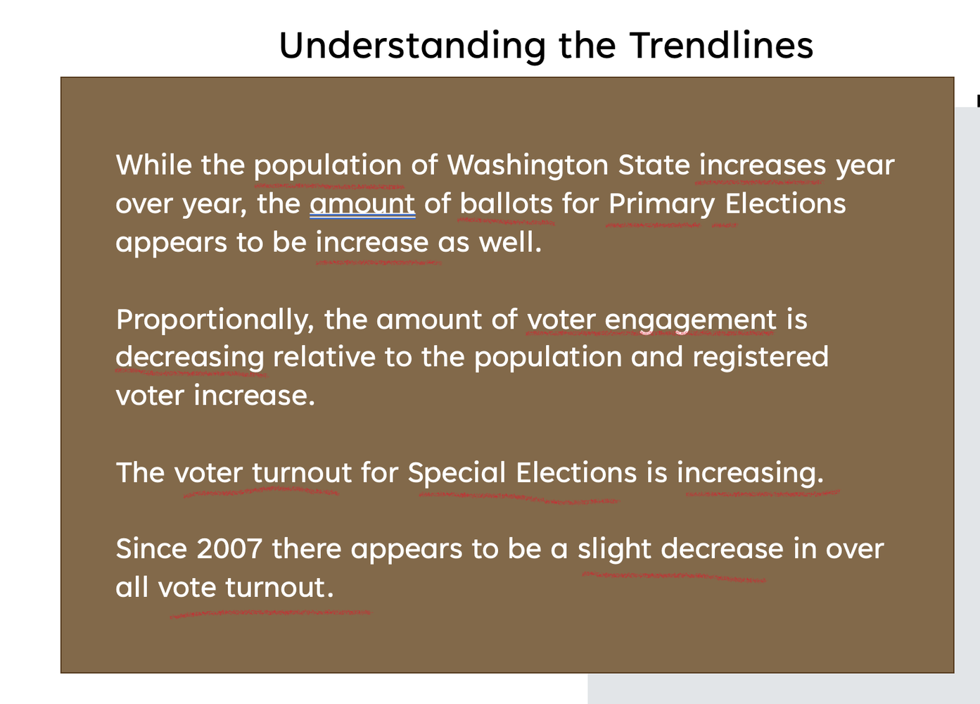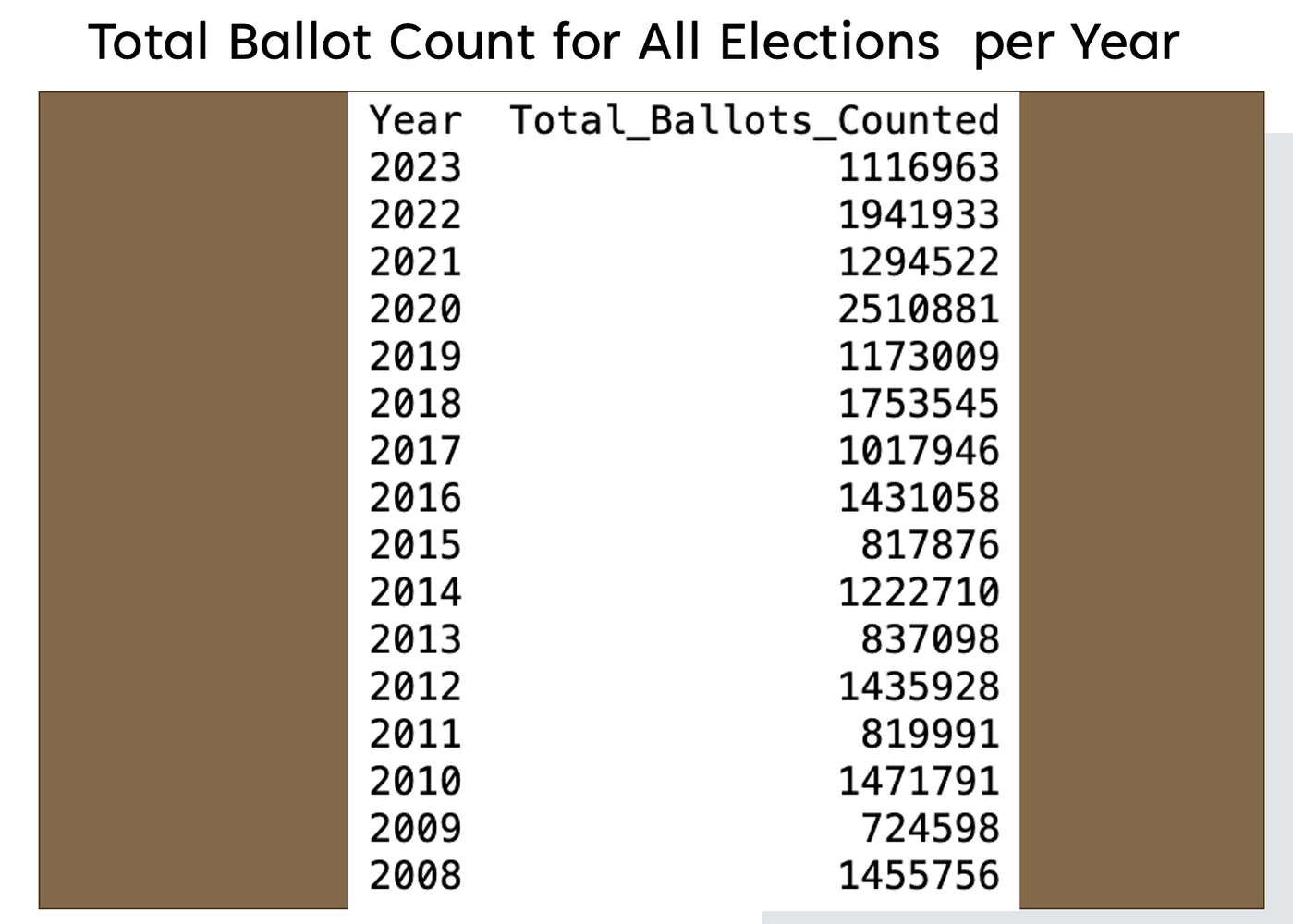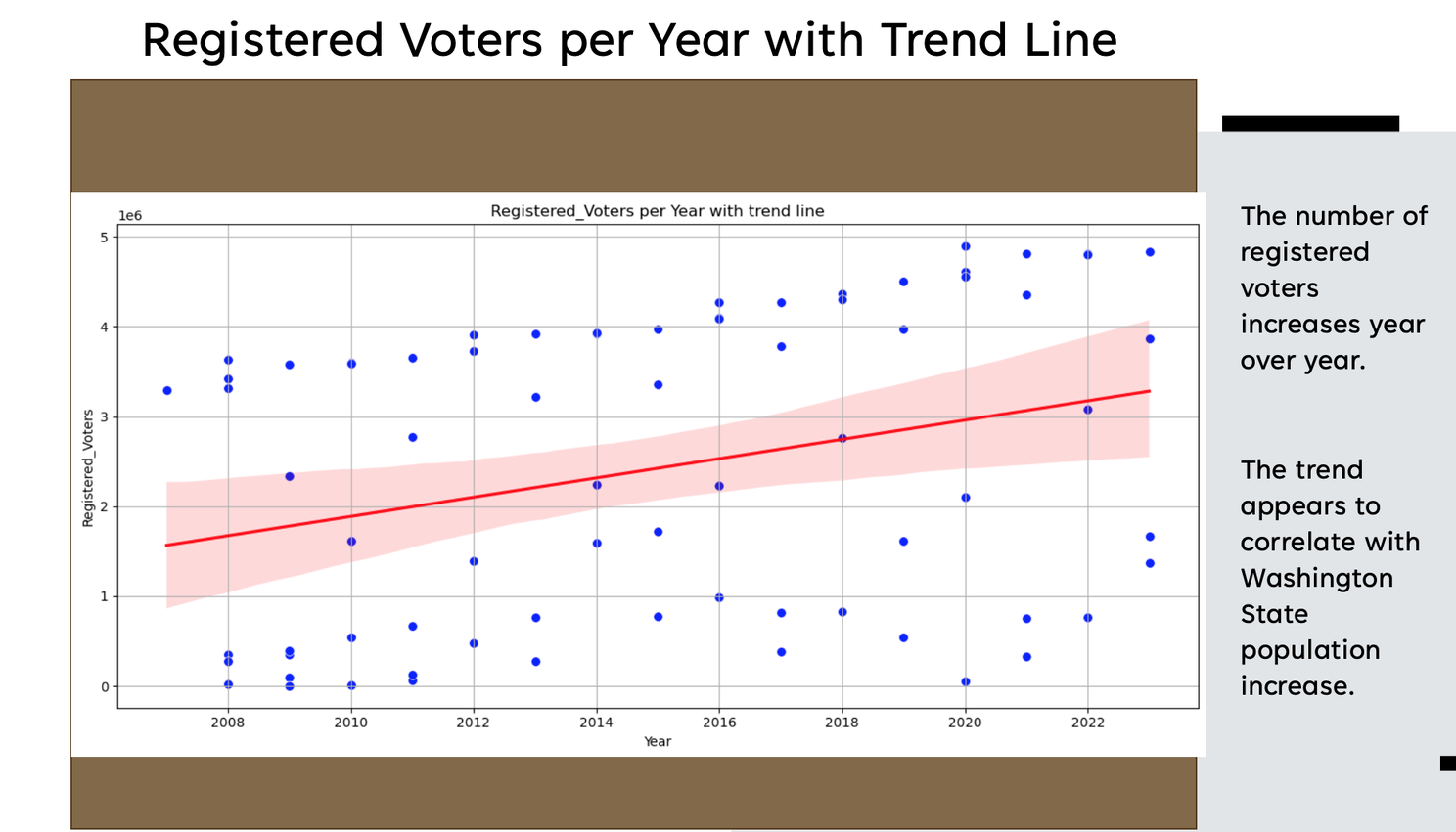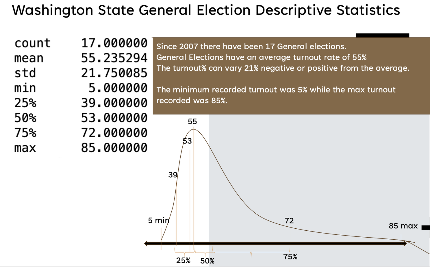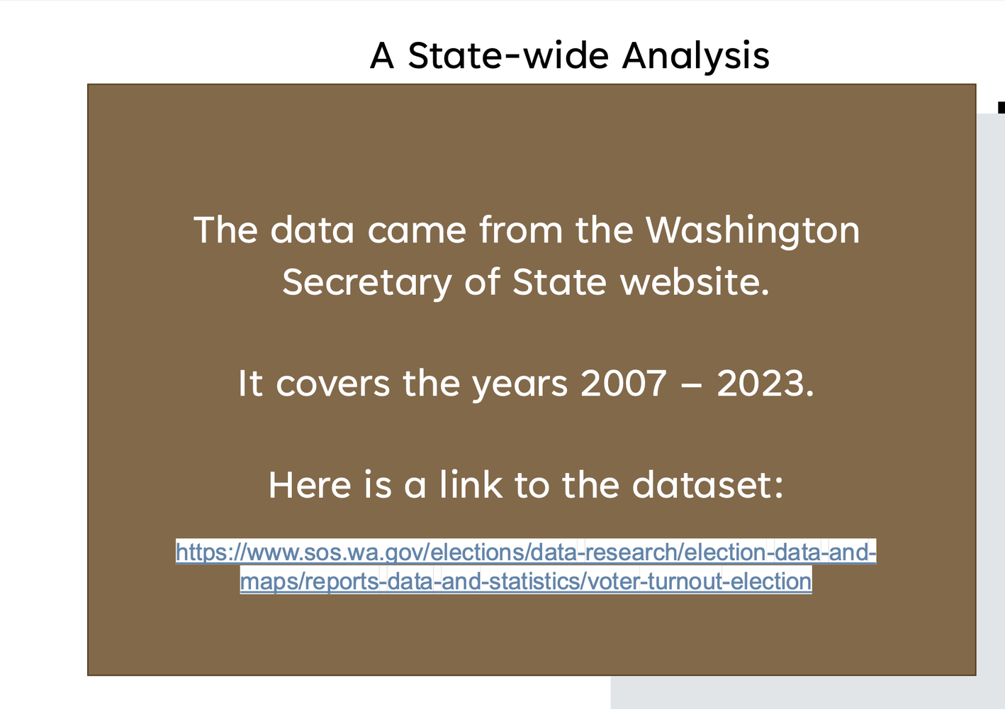 An open-source dataset of Wasington State data containing the necessary variables about voter engagement. The Washington Secretary of State is the open-source repository / organization that hosts the datasets. The dataset contains almost 73 rows (before any rows where removed) and 7 columns. The dataset is limited to only 16 years of elections; Spanning from 2007 – 2023. The dataset has multiple columns for possible exploration. Different voters participate based on numerous exogenous factors. Delimitations for this analysis, while more data was available for previous years earlier than 2007, the variables did not contain voter turnout %.